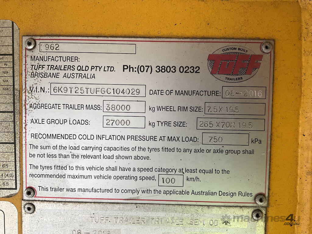 CP: 08/2016,Tuff Trailers,Tri Axle Semi OD,45ft,Tri Axle Drop Deck Widener,731731 (Kms. Showing on Hubometer),Colour: Yellow,Rego. No: NP(YO03BM), Unregistered,VIN: 6K9T25TUFGC104029,Serial No: 6K9T25TUFGC104029,Sold with No Plates