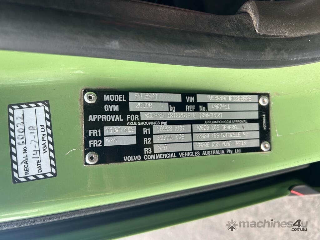 CP: 01/2016,Volvo,FH Series,Prime Mover Sleeper Cab,Automatic,Airbag,D13,6 Cyl,Diesel,1474304 (Kms. Showing on Odometer),Hourmeter not visible,Colour: Green,Unregistered,VIN: YV5RG40D3FD202676,Key No: 296,GVM: 28100,GCM: 90000,Sold with No Plates,Key No: 296