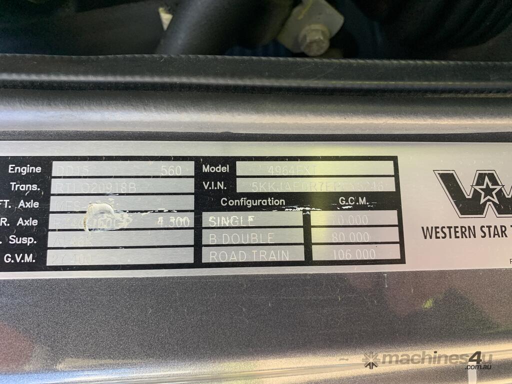 CP: 07/2016,Western Star,4900 FXT Stratosphere,Prime Mover Sleeper Cab,Air Bag,Engine #: 472907S0221763,DD15,14.8 Ltr,6 Cyl,Diesel,18 Gears,314321 (Kms. Showing on Odometer),17630 (Hrs. Showing on Hour meter),Colour: Grey,Unregistered,VIN: 5KKJAEDR7EPFY5246,GVM: 27400,GCM: 106000,Sold with No Plates