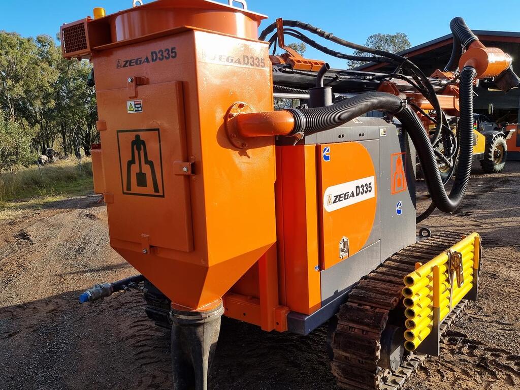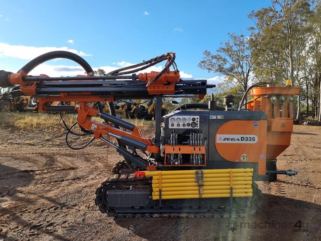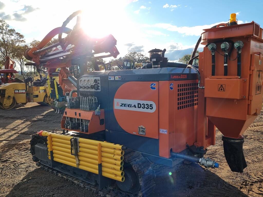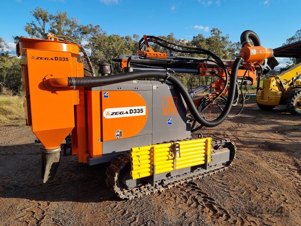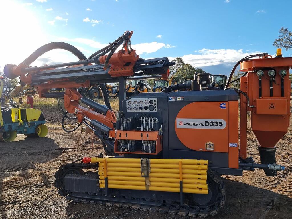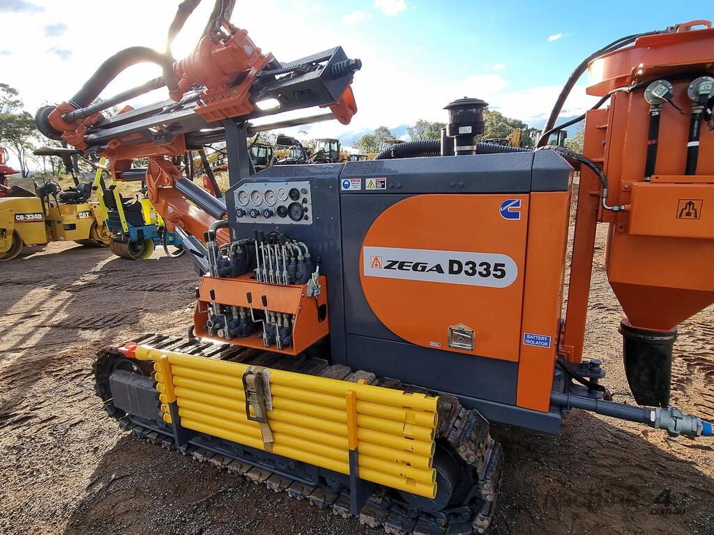 ZEGA Down the Hole Hammer D335 DTH Drill RIG, Track Drive / Track Mounted, Powered by 3.9L 60Kw 4Cyl Turbo DCEC 4BTA3.9-C80-II CUMMINS Diesel Engine, Drill SMU/Tacho Unit showing 347hrs. Includes Spare Drill Rods, Connecting Hose And Accessories, Unit is fitted with Racks Containing 12ea x 1500mm Drill Rods mounted OnBoard and a further 11ea x 1500mm Rods on Pallet with Bull Hose and Tool Box Containing Spares ,Accessories & Drill Bits,