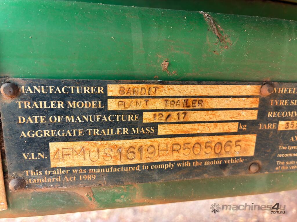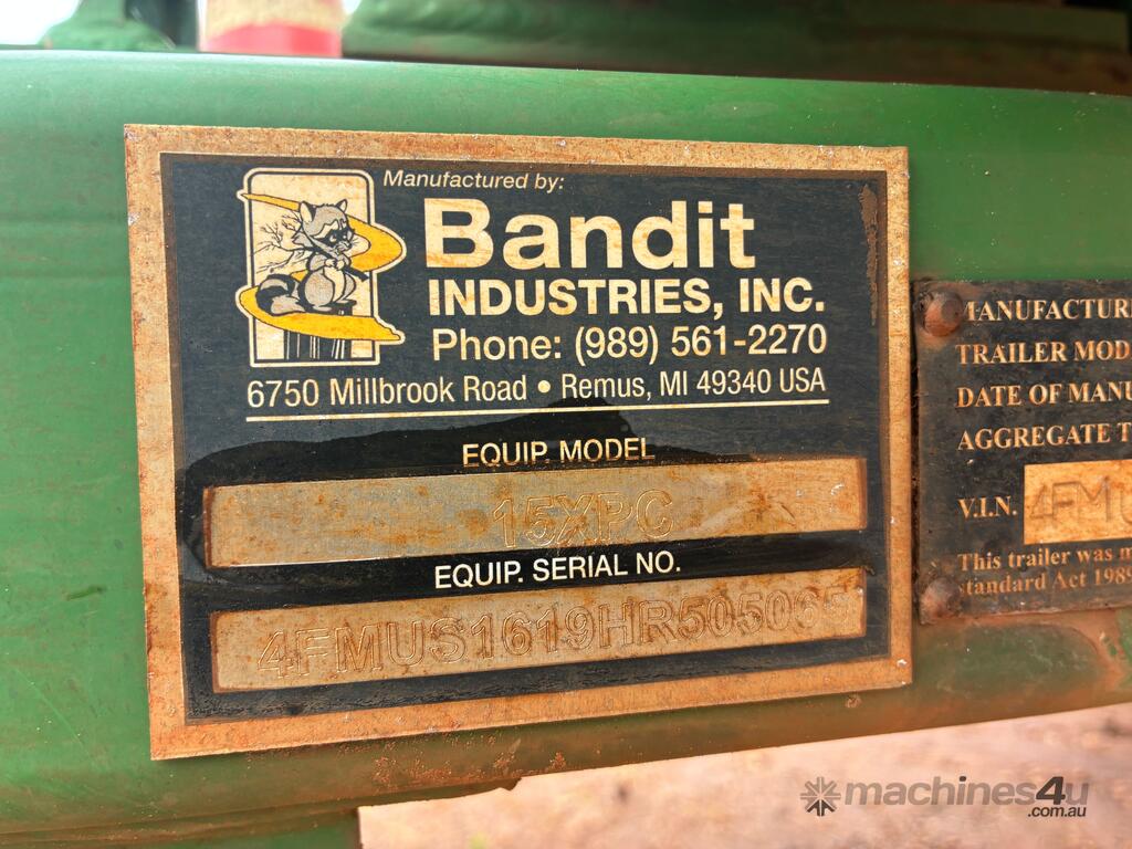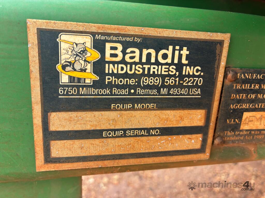 CP: 12/2017,Bandit,15XPC,Wood Chipper (Trailer Mounted),Odometer not visible,858 (Hrs. Showing on Hour meter),Rego. No: NP(1TSX288), Unregistered WA,Serial No: 4FMUS1619HR505065,Sold with No Plates