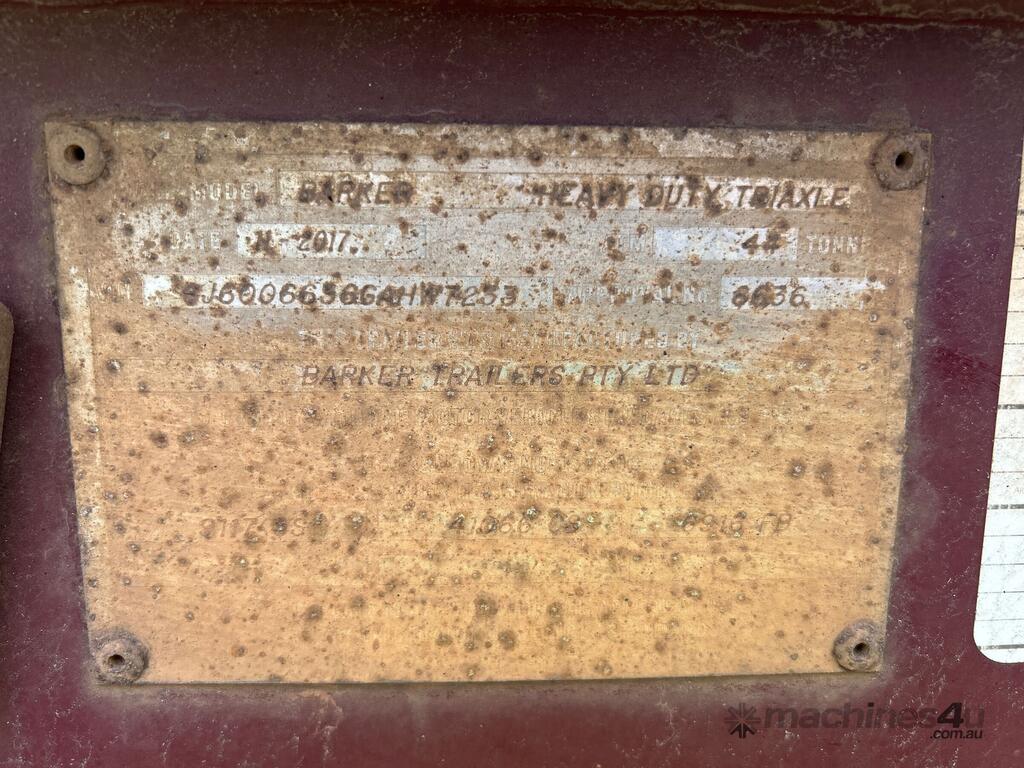 CP: 11/2017,Barker,Heavy Duty Tri Axle,Tri Axle Skel Trailer,Hubometer not visible,Colour: Maroon,Rego. No: NP(402UFW), Unregistered QLD,VIN: 6J6006636GAHW7233,Sold with No Plates