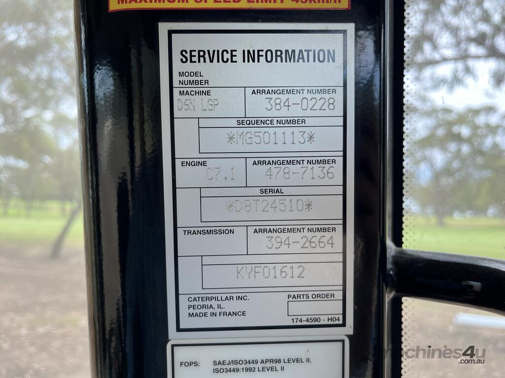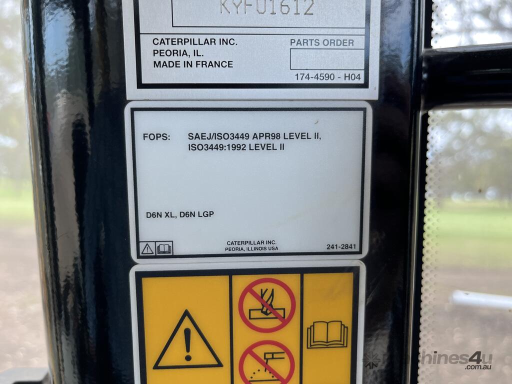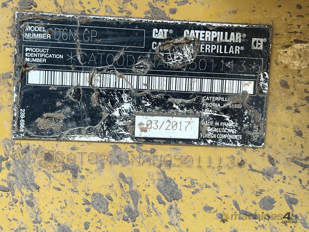 CP: CIRCA 2017,Caterpillar,D6N LGP,Dozer (Swamp Tracks),Engine #: D8T24510,6 Cyl,Diesel Turbo,Odometer not visible,4179 (Hrs. Showing on Hour meter),Colour: Yellow,Unregistered,Chassis: MG501113,Serial No: CAT00D6NAMG501113,FOPS No: undefined,Sold with No Plates