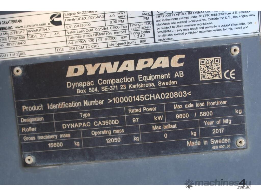 2017 Dynapac CA3500D :      $89,000 AUD($97,900 Inc. GST)