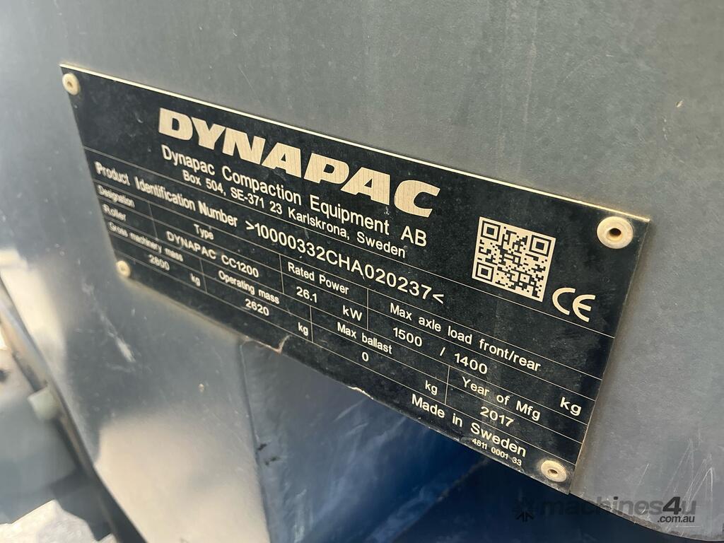CP: CIRCA 2017,Dynapac,CC1200,Articulated Dual Smooth Drum Roller,3 Cyl,Diesel,Odometer not visible,705 (Hrs. Showing on Hour meter),Colour: Yellow,Unregistered,Serial No: 10000332CHA020237,Sold with No Plates