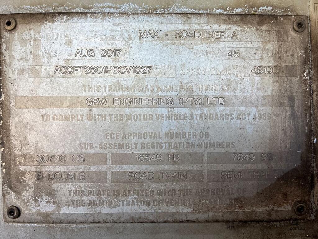 CP: 08/2017,Built: 08/2017,GRW Engineering Pty Ltd,Max - Roadliner A,Tri Axle Fuel Tanker A-Trailer,Hubometer not visible,Colour: Galvanised,Rego. No: NP(464UFI), Unregistered QLD,VIN: AC9FT2601HBCV1927,Sold with No Plates