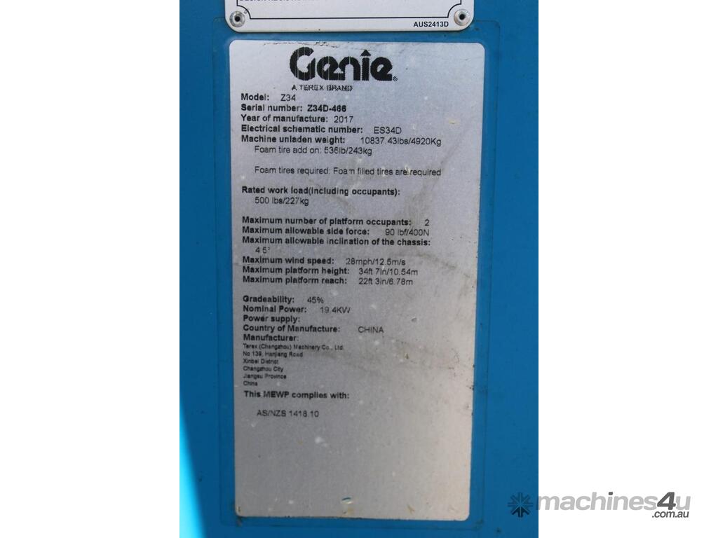 Used Genie Articulated Boom Lifts for sale - 2017 Genie Z34/22IC :      $25,000 AUD($27,500 Inc. GST)