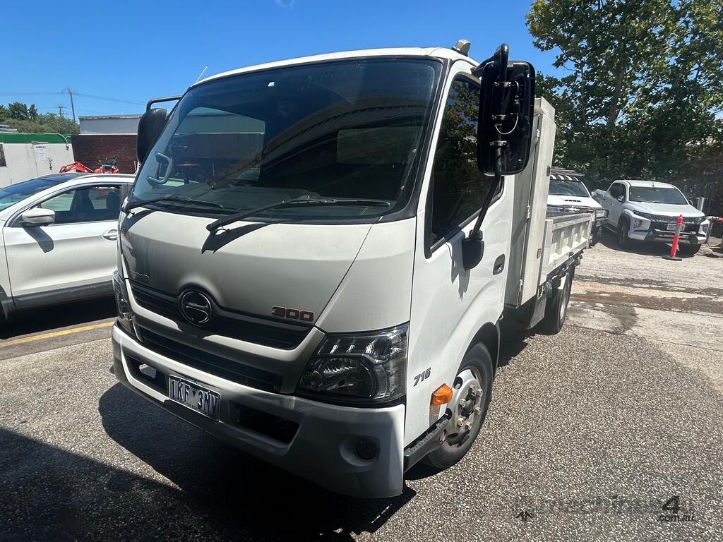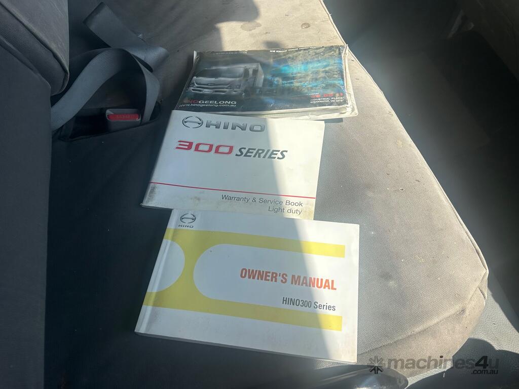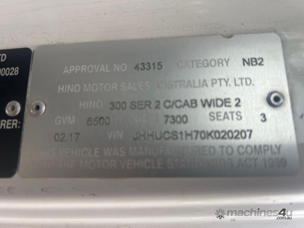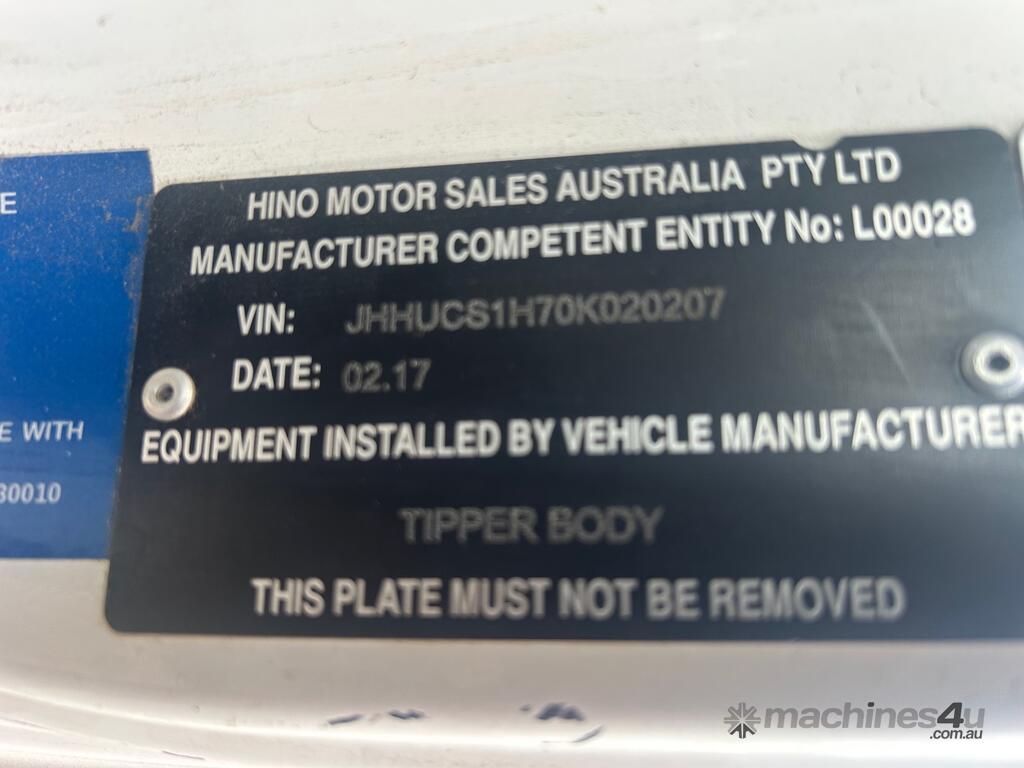 2/2017 Hino 300 series 2 (716) wide 2, 3-seater cab chassis, 4-cylinder inline diesel engine, automatic transmission, electric windows, A/C, reverse camera, 1 x key, owner's manual, service book, fitted with 3.6mt tipping body, behind cab toolbox, tow bar.