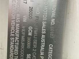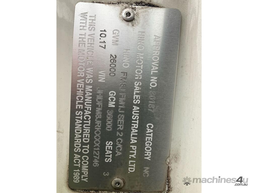 CP: 10/2017,Hino,500 2628 FM,Garbage Compactor (Side Load),Automatic,Airbags ,Euro 5,6 Cyl,Diesel Turbo,111124 (Kms. Showing on Odometer),8128 (Hrs. Showing on Hour meter),Colour: White,Rego. No: CP69DL NSW,Rego expiry: 01/08/2026,VIN: JHDFM8JRKXXX12746,Key No: 456E,Length: 9.3 m,GVM: 26000,GCM: 36000,Sold with No Plates,Key No: 456E