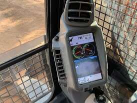 Features include a dozer blade, angel tilting quick hitch, and a Trimble GPS machine control system with receiver mushrooms and screen included. The air-conditioned cab and full safety railings ensure operator comfort and safety.
