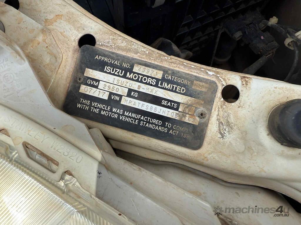 2017 Isuzu D-Max Single Cab Utility, Rego No: CD04PE (Sold Unregistered), VIN: MPATFS85JHT009663, Odometer: 212,902km, Colour: White, Fuel: Diesel, Transmission: Automatic, GVM: 2,950kg, Tyres Good, Includes: Bullbar, Towball, Fitted with Canopy Fitout Shelving, Safety Lights, Vehicle Wrapped Company Signage, Note: Some Wear and Tear on Paint Work, Dent Front Right Panel, Small Rust Appearing, Service History Complete. Location: Unit 3/97 Pruen Road, Berrimah NT. Inspection Recommended, See Photos For More Details. A Buyers Premium of 10.45% (GST Inc) Will Be Applied.