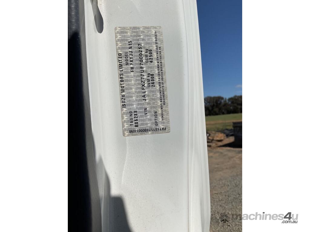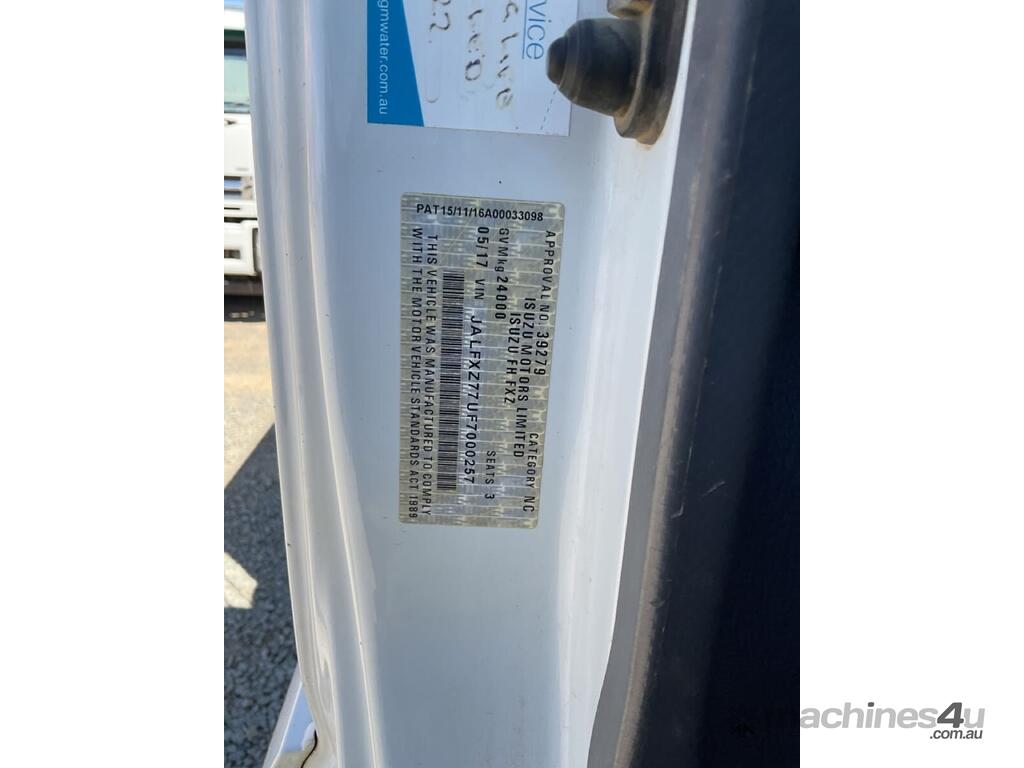CP: 05/2017,Built: 05/2017,Isuzu,FXZ1500,Tipper Day Cab,Automatic,Airbag Suspension,547429 (Kms. Showing on Odometer),Hourmeter not visible,Colour: White,Rego. No: NP(1KG8UO), Unregistered VIC,VIN: JALFXZ77UF7000257,GVM: 24000,GCM: 42500,Sold with No Plates