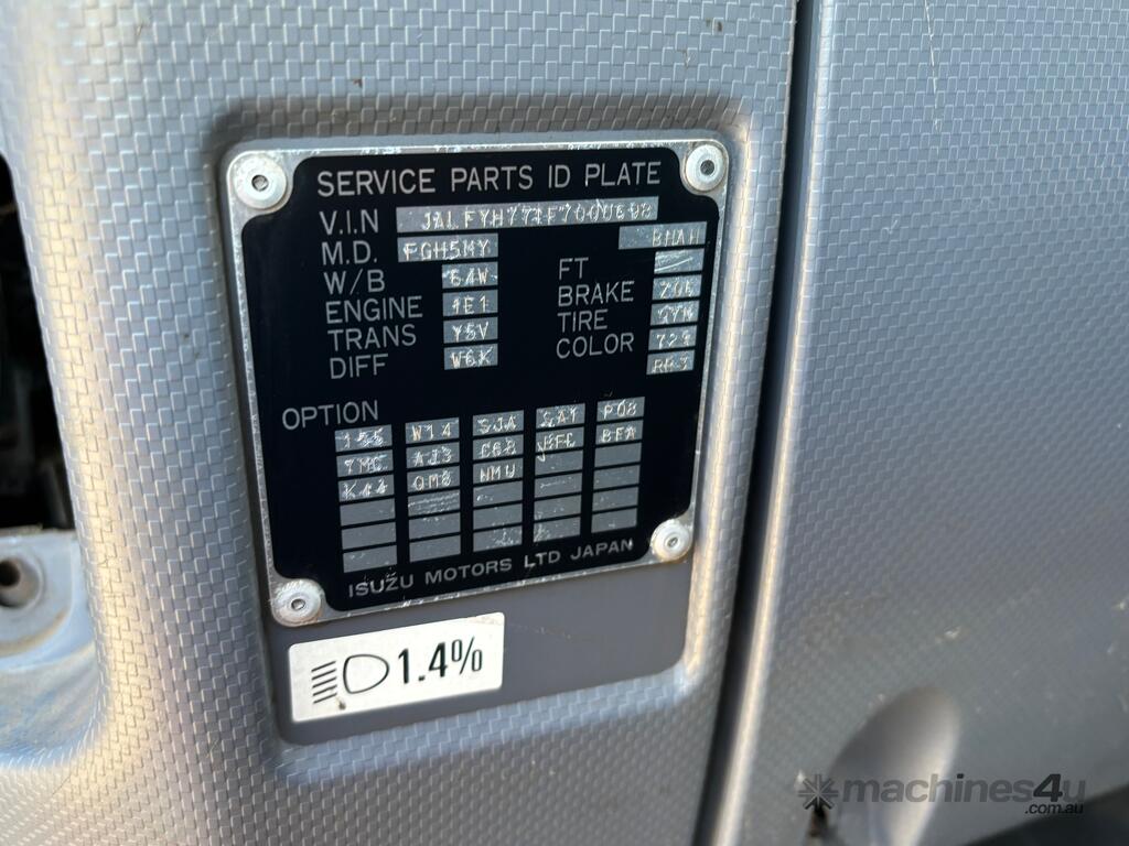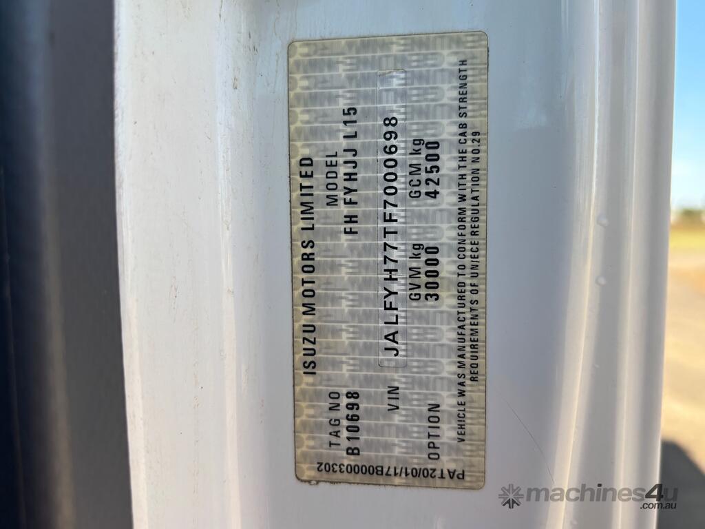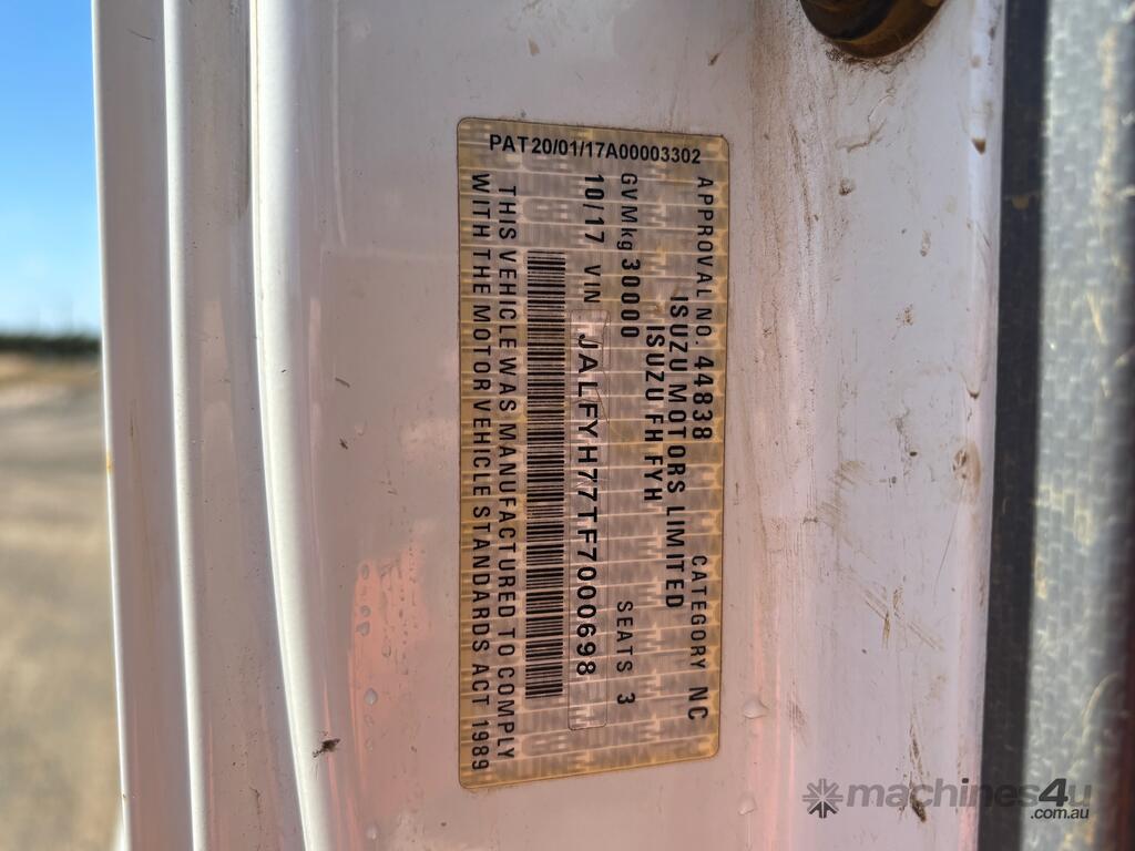 CP: 10/2017,Built: 10/2017,Isuzu,FYH2000,Water Tanker (Day Cab),Automatic,Spring Suspension,Engine #: 629008,Isuzu,6 Cyl,Diesel,Intercooler Turbo,181960 (Kms. Showing on Odometer),Hourmeter not visible,Colour: White,Rego. No: NP(XQ08ZC), Unregistered NAT,VIN: JALFYH77TF7000698,GVM: 30000,GCM: 42500,Sold with No Plates,WOVR Status: WOVR N/A