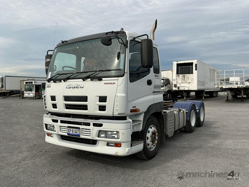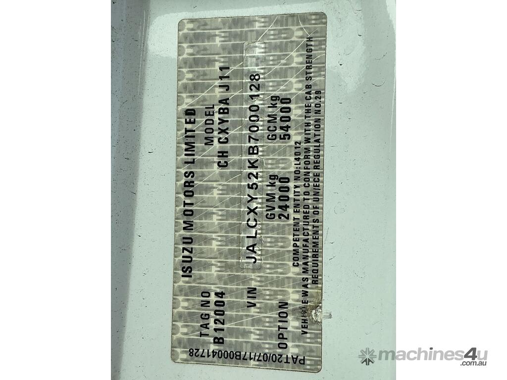 CP: 11/2017,Isuzu,Giga CXY Premium,Prime Mover,Automated Manual Transmission,Airbags ,Engine #: 6WG1433603,Sitec ,6 Cyl,Diesel Turbo,61764 (Kms. Showing on Odometer),Hourmeter not visible,Colour: White,Rego. No: XP91AT NSW,Rego expiry: 28/05/2026,VIN: JALCXY52KB7000128,Key No: 519S,Length: 6.9 undefined,GVM: 24000,GCM: 54000,Sold with No Plates,Key No: 519S
