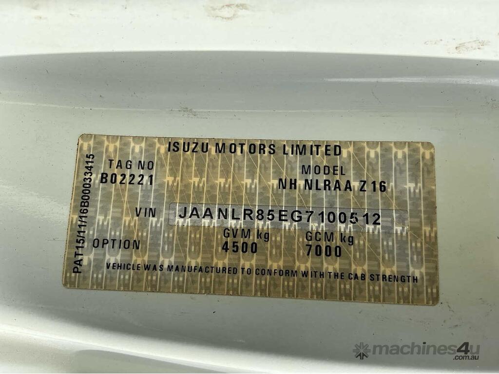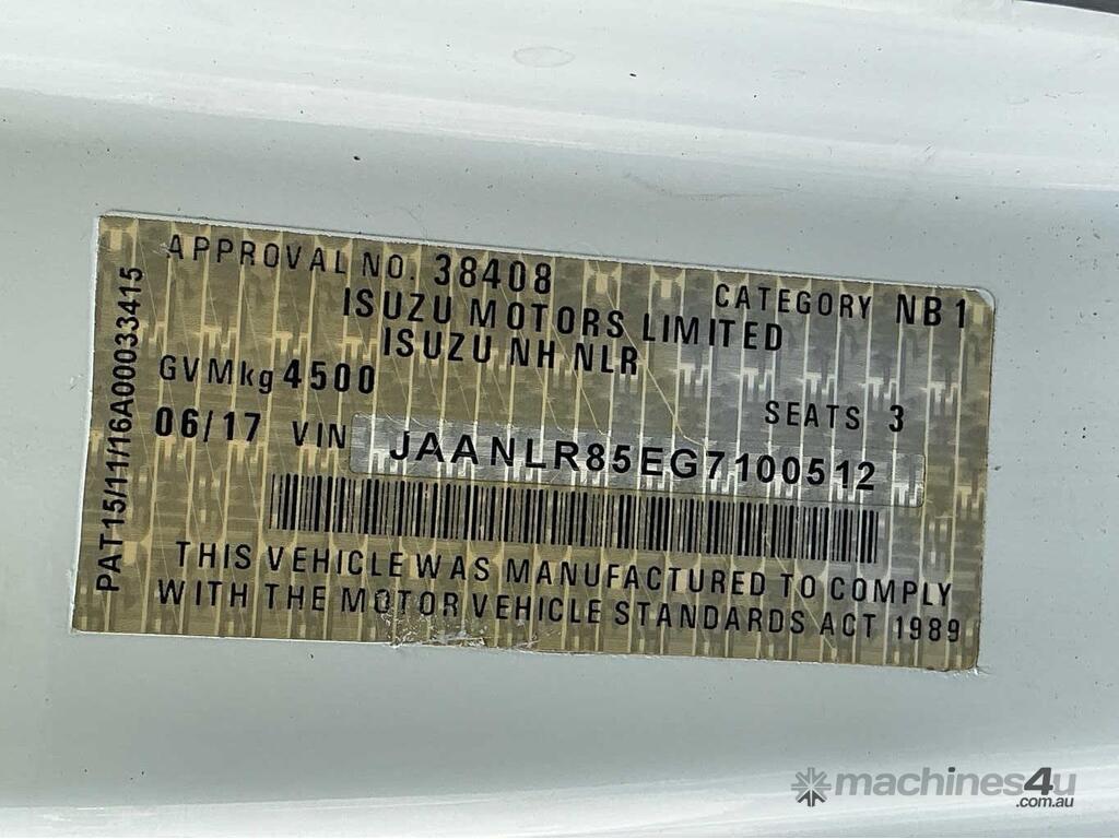 CP: 06/2017,Isuzu,NLR 45-150,Service Body,Automatic,Spring ,Engine #: 4JJ12T4563,4 Cyl,Diesel Turbo,202265 (Kms. Showing on Odometer),Hourmeter not visible,Colour: White,Rego. No: 043XOE QLD,VIN: JAANLR85EG7100512,Key No: 350E,Length: 3.2 m,GVM: 4500,GCM: 7000,Sold with No Plates,Key No: 350E