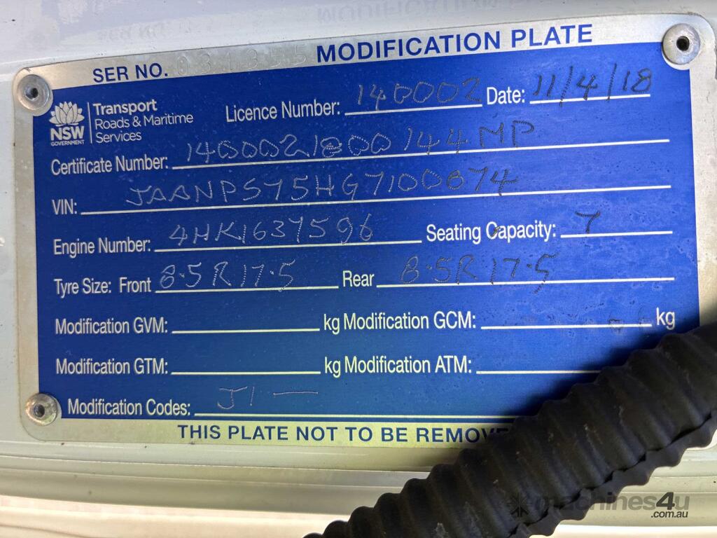 CP: 08/2017,Isuzu,NPS 75-155,Crew Cab Service Body,Manual,Spring,Engine #: 4HK1637596,4 Cyl,Diesel Turbo,5 Gears,68924 (Kms. Showing on Odometer),Hourmeter not visible,Colour: White,Rego. No: NP(CP68SK), Unregistered NSW,VIN: JAANPS75HG7100874,Key No: 306,Length: 6.7 m,GVM: 7500,GCM: 11000,Sold with No Plates,Key No: 306
