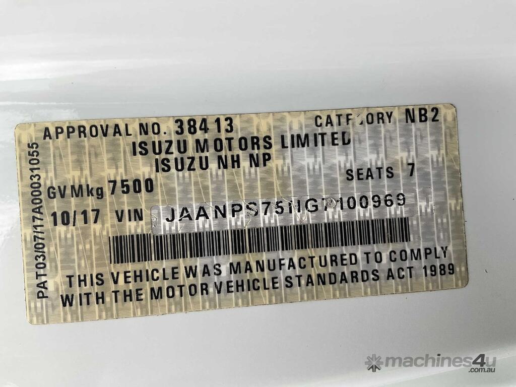 CP: 10/2017,Built: 10/2017,Isuzu,NPS 75-155,Crew Cab Service Body,Manual,Spring,Engine #: 4HK1654923,5190 CC,4 Cyl,Diesel Turbo,5 Gears,82795 (Kms. Showing on Odometer),Hourmeter not visible,Colour: White,Rego. No: NP(CQ48CS), Unregistered NSW,VIN: JAANPS75HG7100969,Key No: 119,Length: 6.4 m,GVM: 7500,GCM: 11000,Sold with No Plates,Key No: 119