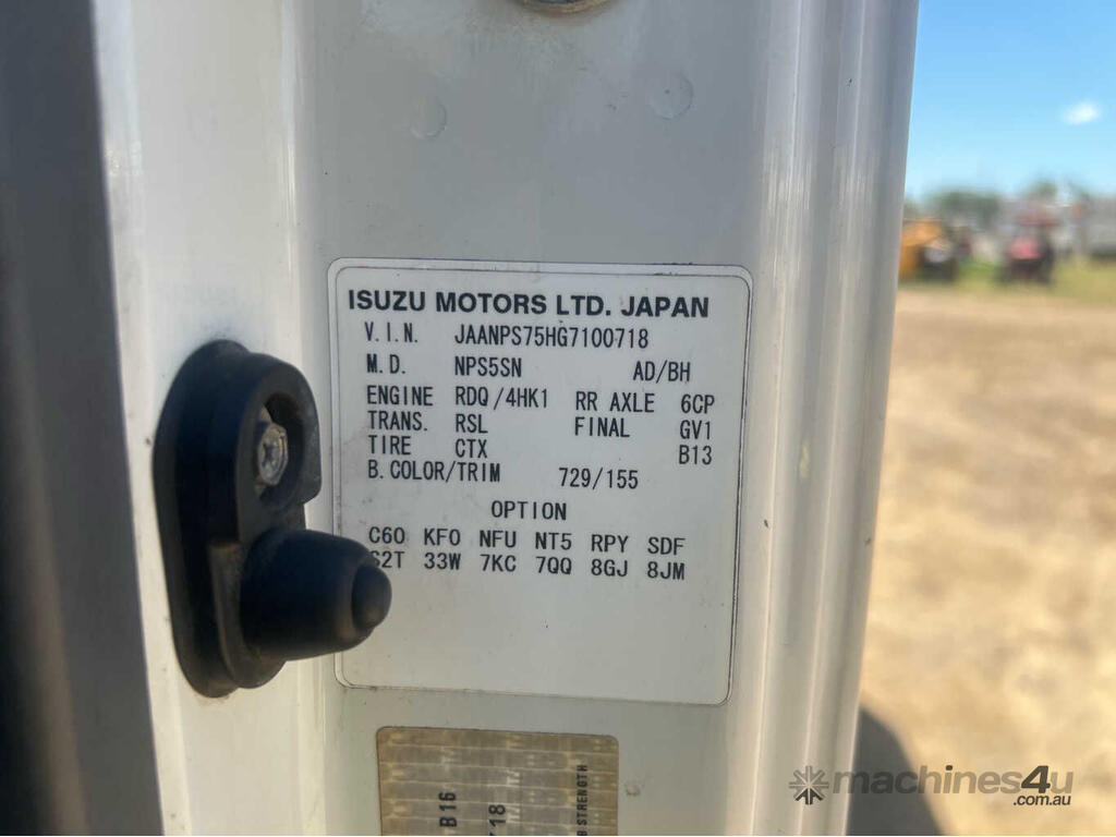 CP: 04/2017,Built: 04/2017,Isuzu,NPS 75-155,Service Body / Crane Truck,Manual,Spring Suspension,Engine #: 4HK1601444,4 Cyl,Diesel,269401 (Kms. Showing on Odometer),Hourmeter not visible,Colour: White,Rego. No: NP(024XNF), Unregistered QLD,VIN: JAANPS75HG7100718,Key No: T33,Length: 6.3 m,GVM: 7500,GCM: 11000,Sold with No Plates,Key No: T33