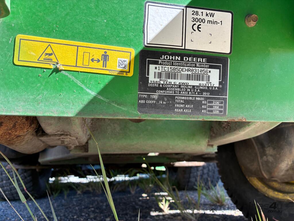 CP: CIRCA 2017,John Deere,1585 Terrain Cut,Ride On Mower (Out Front),3 Cyl,Diesel,Odometer not visible,1580 (Hrs. Showing on Hour meter),Colour: Green,Unregistered,Serial No: 1TC1585DEHR031056,Sold with No Plates