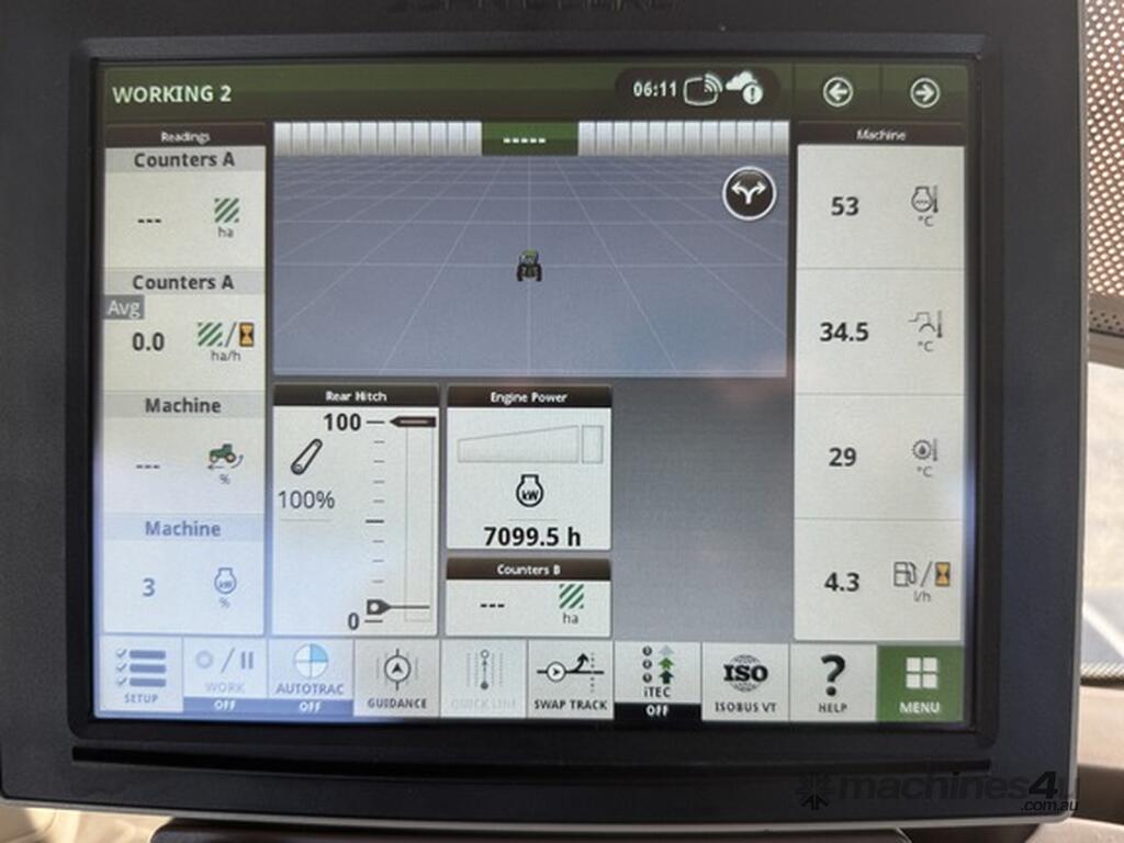 John Deere 8370RT, 7100 hours, IVT Transmission, Gen 4 Display with Autotrac Premium Activation, Premium Command View Cab, 60 GPM pump with four remotes, Three point linkage with quick hitch, 1000 RPM rear PTO,