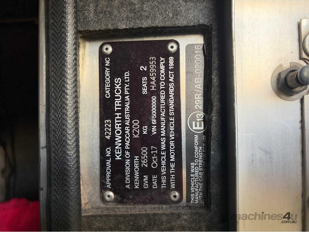 CP: 10/2017,Kenworth,K200 Aerodyne,Prime Mover Big Cab,Manual,Trunnion,Engine #: 79995499,X15 Euro V,6 Cyl,Diesel Turbo,18 Gears,631306 (Kms. Showing on Odometer),19591 (Hrs. Showing on Hour meter),Colour: White,Rego. No: NP(922XNH), Unregistered QLD,VIN: 6F5000000HA459953,Length: 7.6 m,GVM: 26500,GCM: 240000,Sold with No Plates