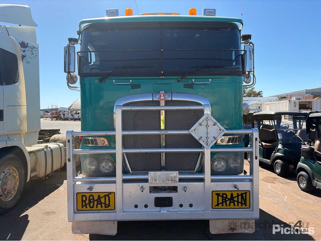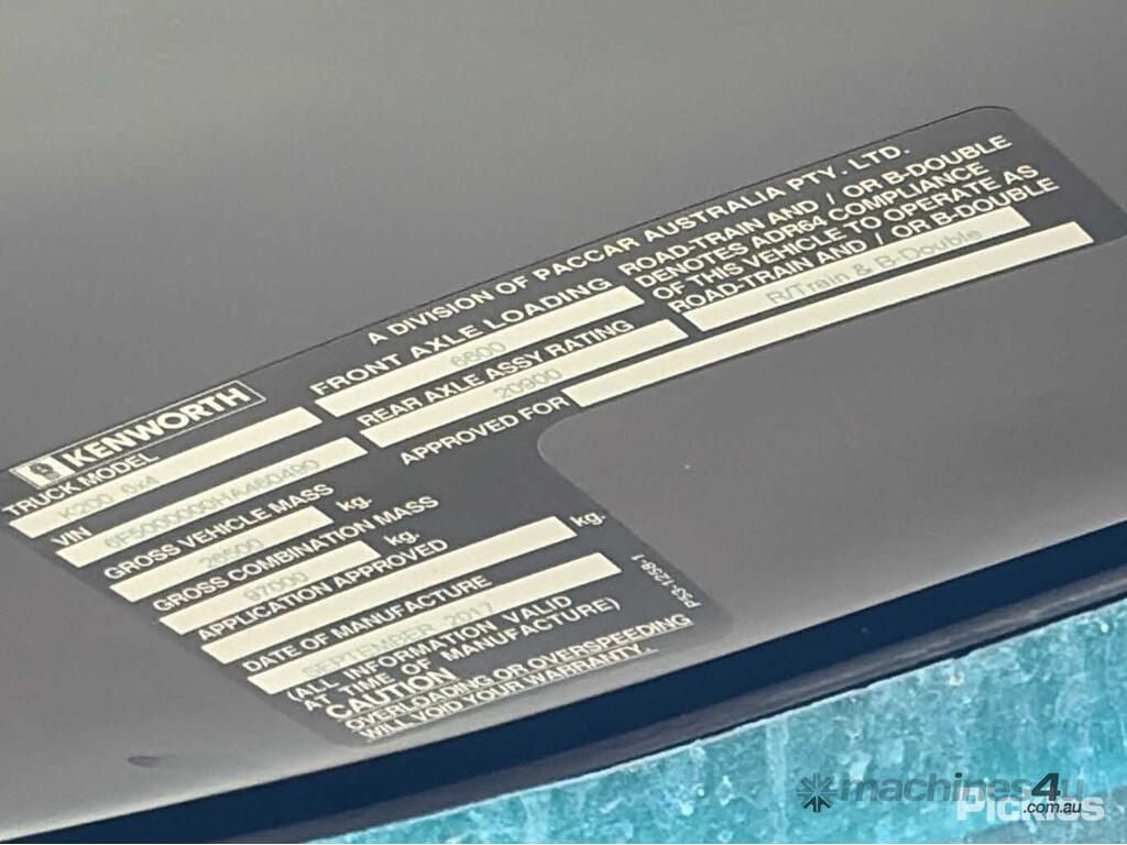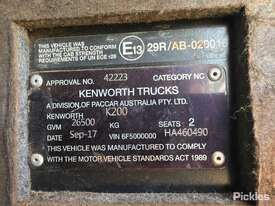 CP: 09/2017,Kenworth,K200 Series,Prime Mover Sleeper Cab,Automatic,Airbag,CUMMINS X15,6 Cyl,Diesel Turbo,59626 (Kms. Showing on Odometer),19671 (Hrs. Showing on Hour meter),Colour: Green,Rego. No: NP(1GJZ002), Unregistered WA,VIN: 6F5000000HA460490,Key No: 10,Length: 6.8 m,GVM: 26500,GCM: 97000,Sold with No Plates,Key No: 10
