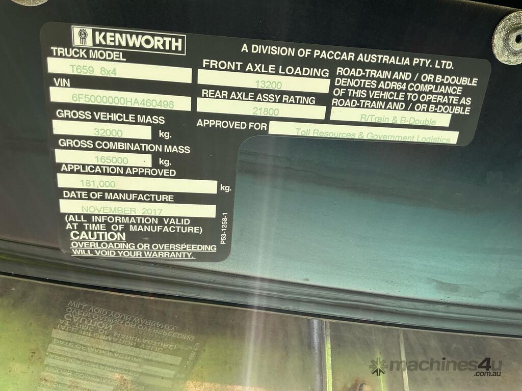 CP: 11/2017,Kenworth,T659,Prime Mover Day Cab,Manual,Airbag,Engine #: 80003937,CUMMINS X15,6 Cyl,Diesel Turbo,18 Gears,519348 (Kms. Showing on Odometer),Hourmeter not visible,Colour: Green,Rego. No: NP(1GJZ013), Unregistered WA,VIN: 6F5000000HA460496,Key No: 253,GVM: 32000,GCM: 181000,Sold with No Plates,Key No: 253