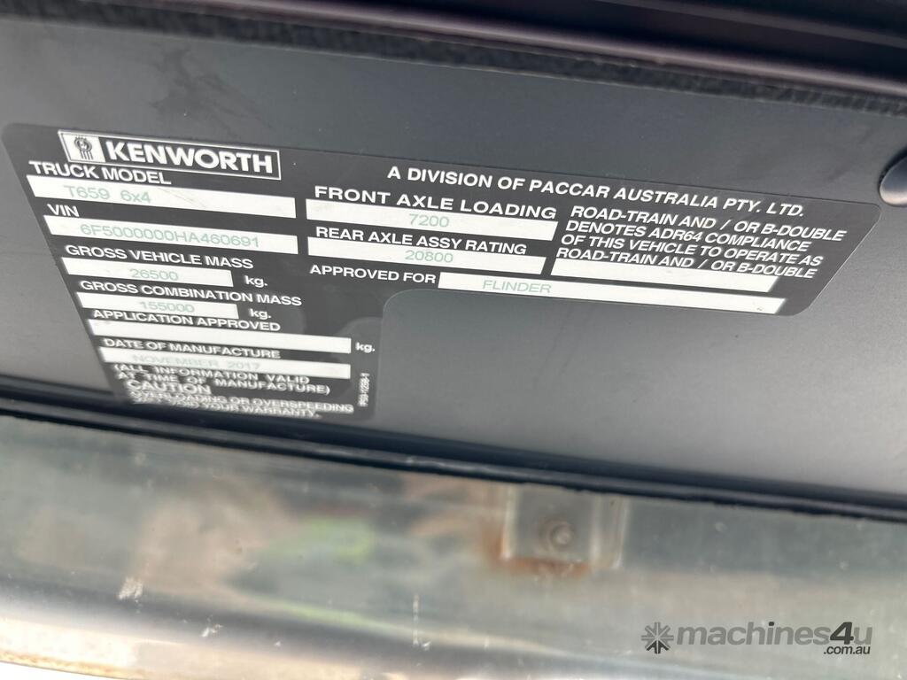 CP: 11/2017,Kenworth,T659,Prime Mover,Manual,Airbag Suspension,Cummins ISX E5,15 Ltr,6 Cyl,Diesel Turbo,18 Gears,257340 (Kms. Showing on Odometer),23630 (Hrs. Showing on Hour meter),Colour: White,Rego. No: NP(691XPD), Unregistered QLD,VIN: 6F5000000HA460691,GVM: 26500,GCM: 155000,Sold with No Plates