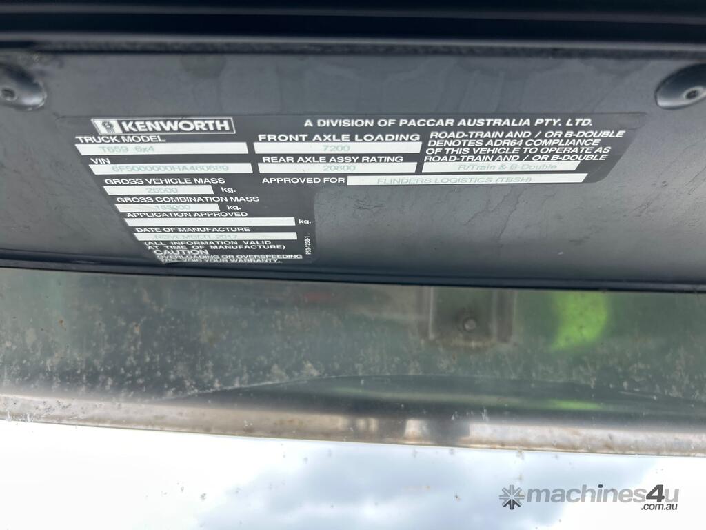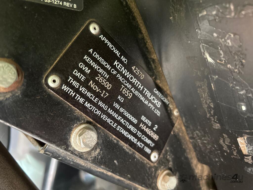CP: 11/2017,Kenworth,T659,Prime Mover,Manual,Airbag Suspension,Engine #: 80461575,Cummins X15 E5 500 HP,6 Cyl,Diesel Turbo,18 Gears,957277 (Kms. Showing on Odometer),23650 (Hrs. Showing on Hour meter),Colour: White,Rego. No: NP(689XPD), Unregistered QLD,VIN: 6F5000000HA460689,GVM: 26500,GCM: 155000,Sold with No Plates