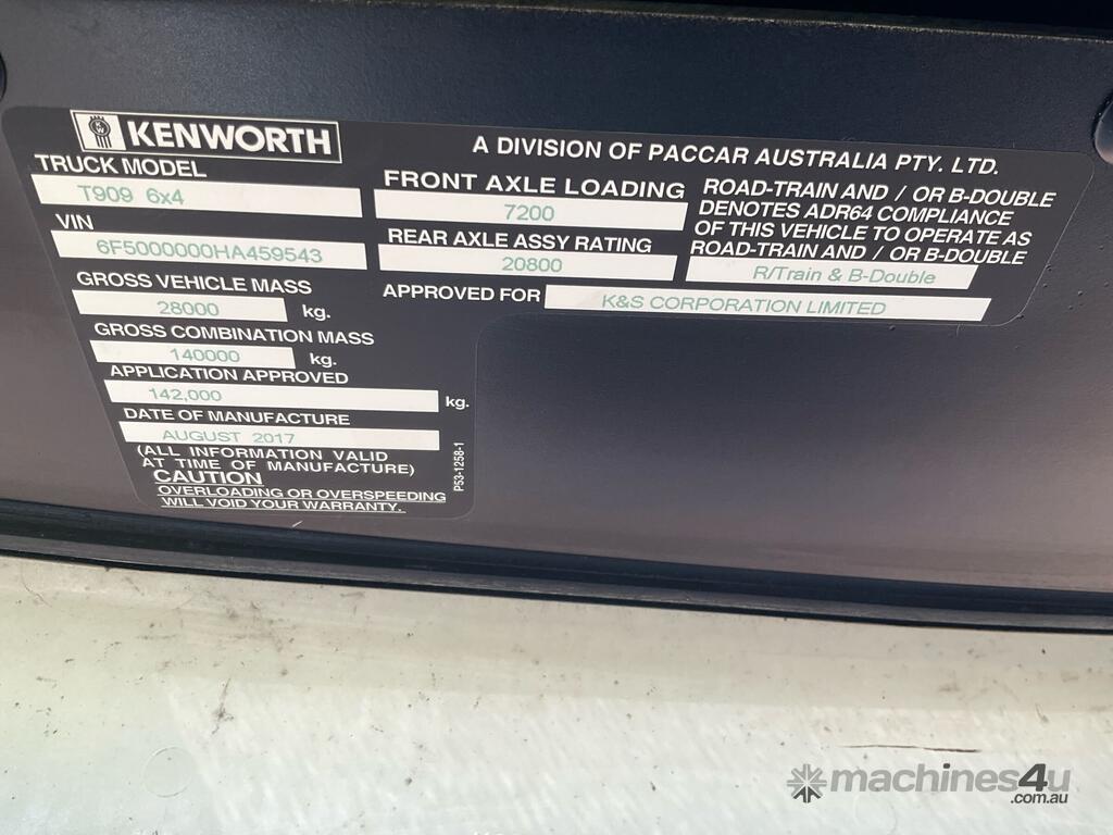 CP: 08/2017,Kenworth,T909,Prime Mover Sleeper Cab,Manual,Airbag Suspention ,Engine #: 79989976,Cummins X15,6 Cyl,Diesel,18 Gears,841610 (Kms. Showing on Odometer),14972 (Hrs. Showing on Hour meter),Colour: White,Unregistered,VIN: 6F5000000HA459543,Length: 8.4 m,GVM: 28000,GCM: 140000,Sold with No Plates