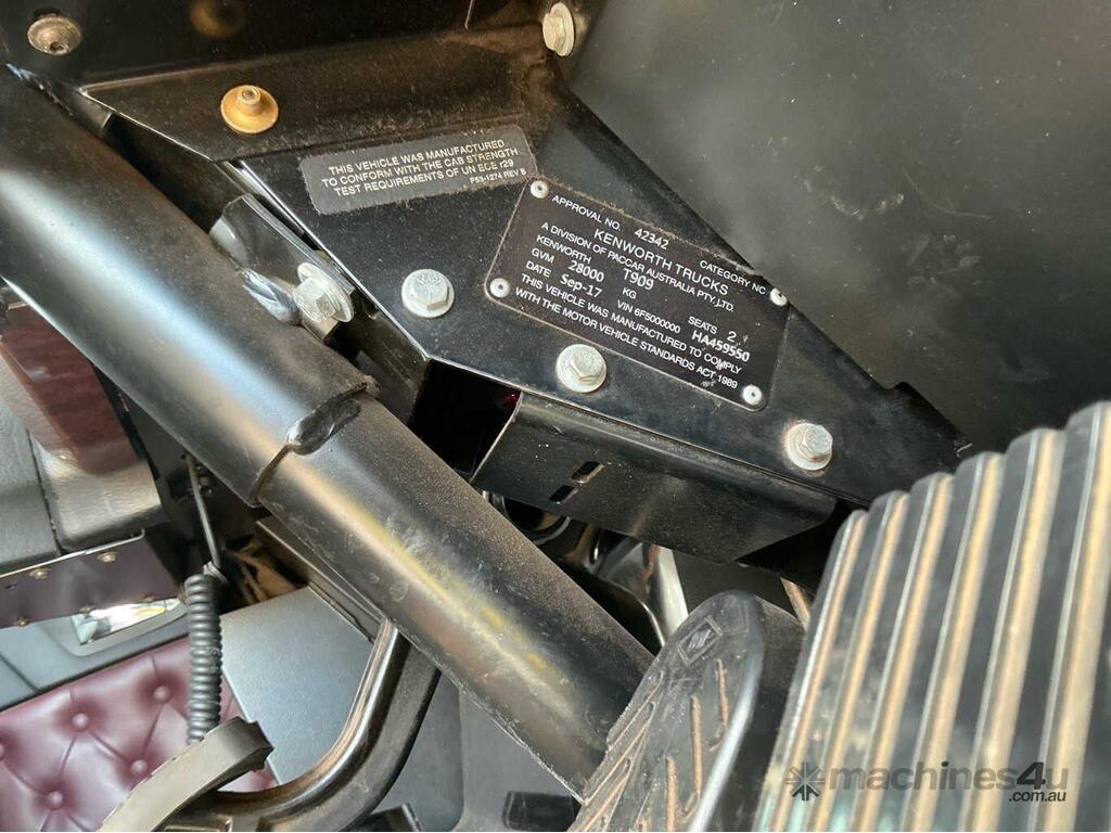 CP: 09/2017,Built: 09/2017,Kenworth,T909,Prime Mover Sleeper Cab,Manual,Airbag,Engine #: 79991304,Cummins X15,15 Ltr,6 Cyl,Diesel Turbo,18 Gears,877693 (Kms. Showing on Odometer),16004 (Hrs. Showing on Hour meter),Colour: White,Unregistered NT,VIN: 6F5000000HA459550,Length: 8.7 m,GVM: 28000,GCM: 142000,Sold with No Plates