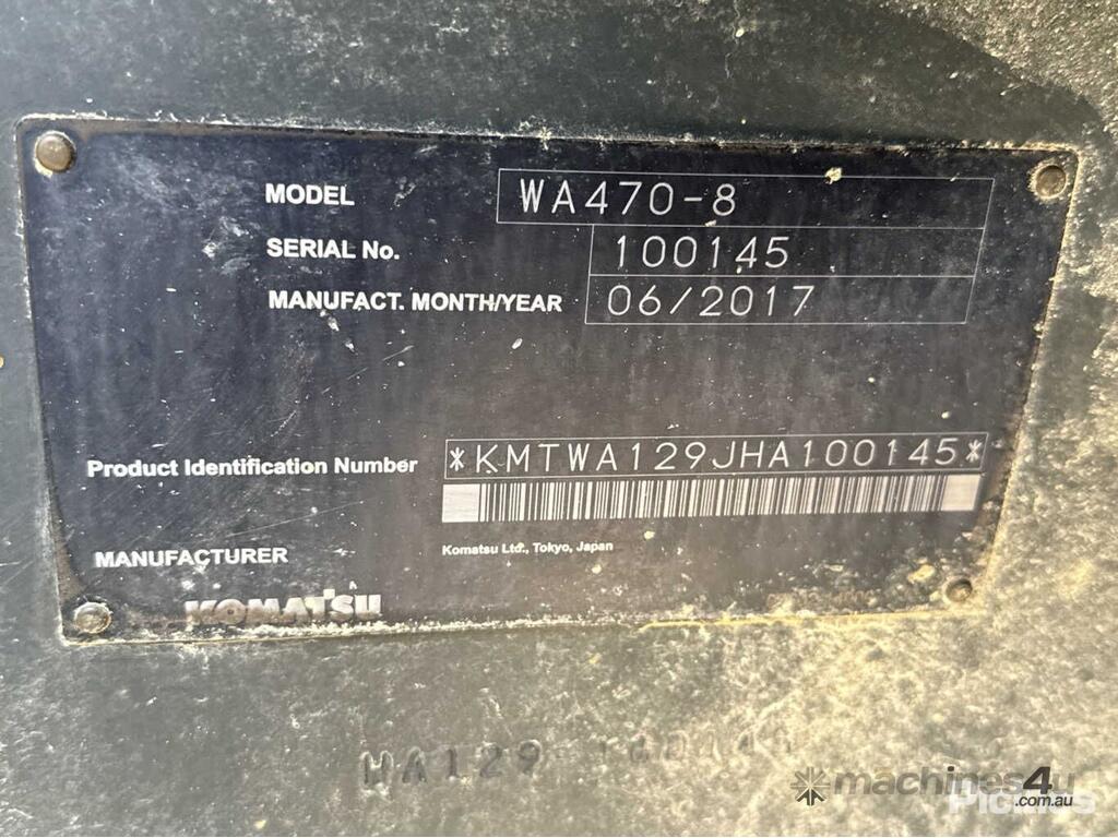 CP: 06/2017,Built: 06/2017,Komatsu,WA470-8,Articulated Loader,6 Cyl,Diesel Turbo,Odometer not visible,11793 (Hrs. Showing on Hour meter),Colour: Yellow,Unregistered,VIN: KMTWA129JHA100145,Serial No: 100145,ROPS No: 7655,Sold with No Plates