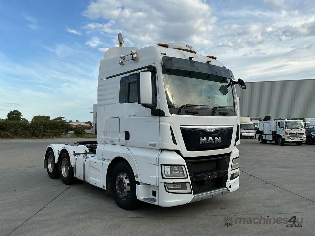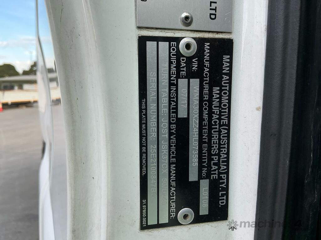 CP: 07/2017,MAN,TGX 26.560,Prime Mover,Automatic,Airbag,Engine #: 4609,MAN,6 Cyl,Diesel,576103 (Kms. Showing on Odometer),14244 (Hrs. Showing on Hour meter),Colour: White,Rego. No: XP72EN,Rego expiry: 09/02/2026,VIN: WMA30XZZ4HL073585,Length: 6.8 m,GVM: 26500,GCM: 70000,Sold with No Plates