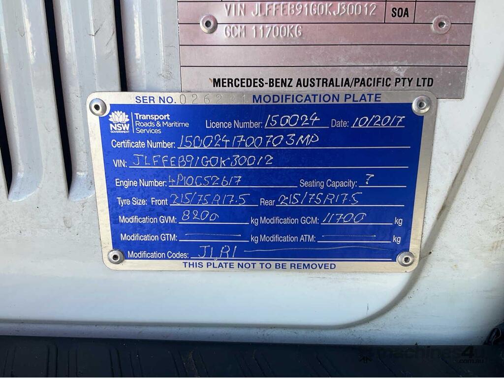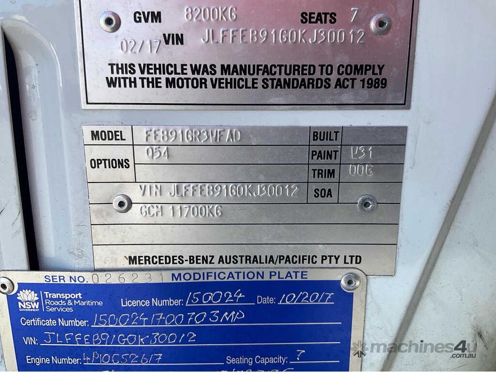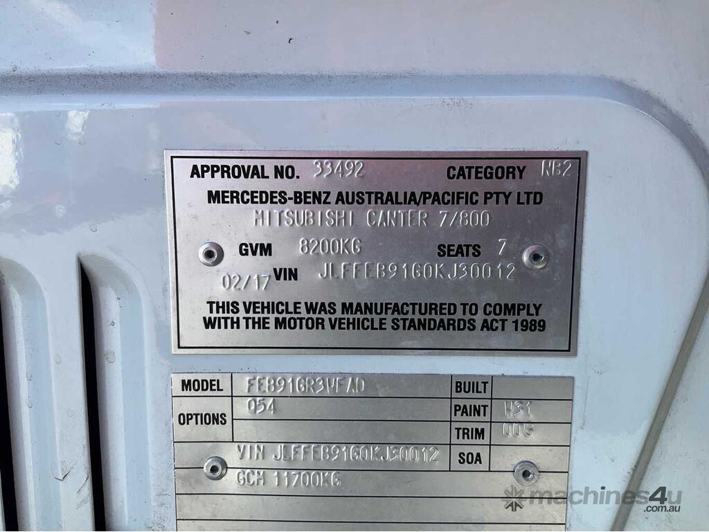 CP: 02/2017,Mitsubishi Fuso,Canter 7/800,Crew Cab Service Body / Crane Truck,Automatic,Springs,Engine #: 4P10C52617,4 Cyl,Diesel Turbo,147130 (Kms. Showing on Odometer),Hourmeter not visible,Colour: White,Rego. No: CN60WS NSW,Rego expiry: 14/09/2026,VIN: JLFFEB91G0KJ30012,Key No: 575S,Length: 6.7 m,GVM: 8200,GCM: 11700,Sold with No Plates,Key No: 575S