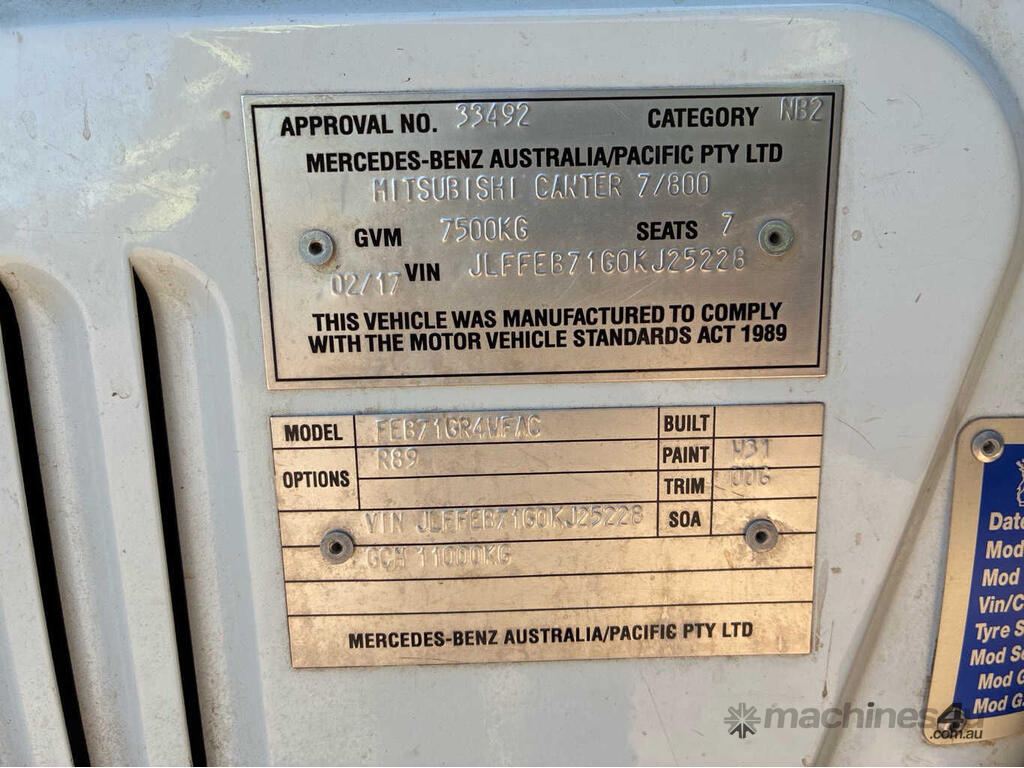 CP: 02/2017,Mitsubishi Fuso,Canter,Crew Cab Table Top,Manual,Spring,4 Cyl,Diesel,Turbo,5 Gears,260869 (Kms. Showing on Odometer),Hourmeter not visible,Colour: White,Rego. No: NP(767XEO), Unregistered,VIN: JLFFEB71G0KJ25228,GVM: 7500,GCM: 11000,Sold with No Plates