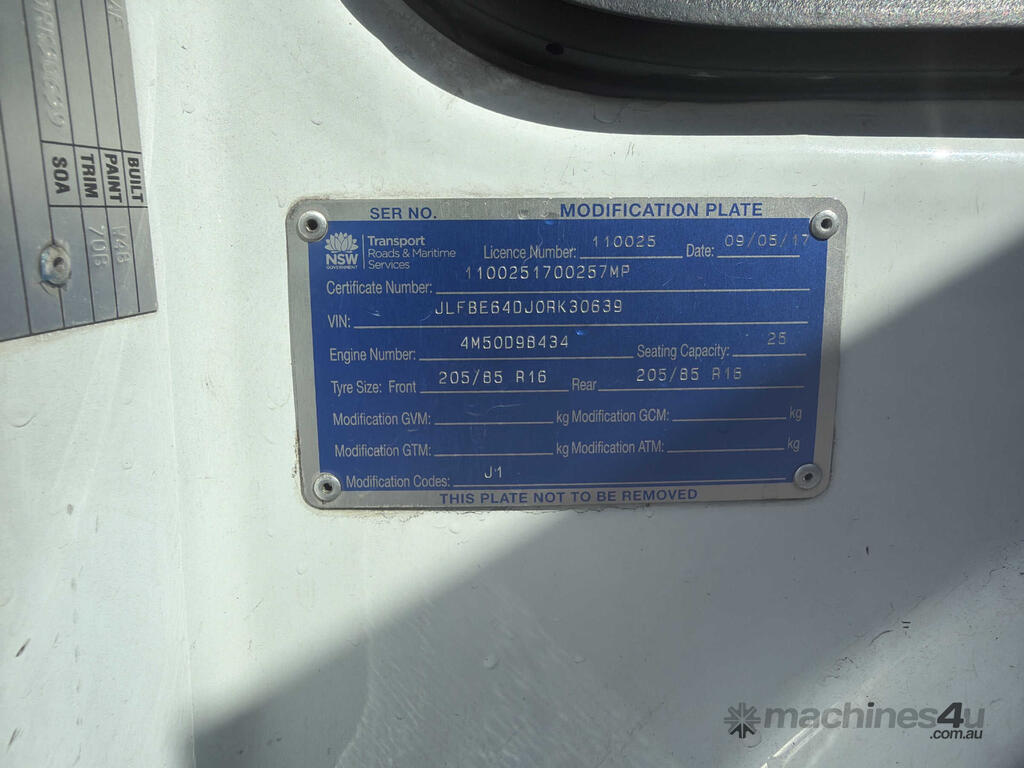 CP: 02/2017,Mitsubishi,Rosa BE600,Bus,Automatic,Spring ,Engine #: 4M50D98434,4 Cyl,Diesel Turbo,247935 (Kms. Showing on Odometer),Hourmeter not visible,Colour: White,Rego. No: CM66BI NSW,Rego expiry: 01/02/2026,VIN: JLFBE64DJ0RK30639,Key No: 110E,Length: 7.7 m,GVM: 6285,Sold with No Plates,Key No: 110E