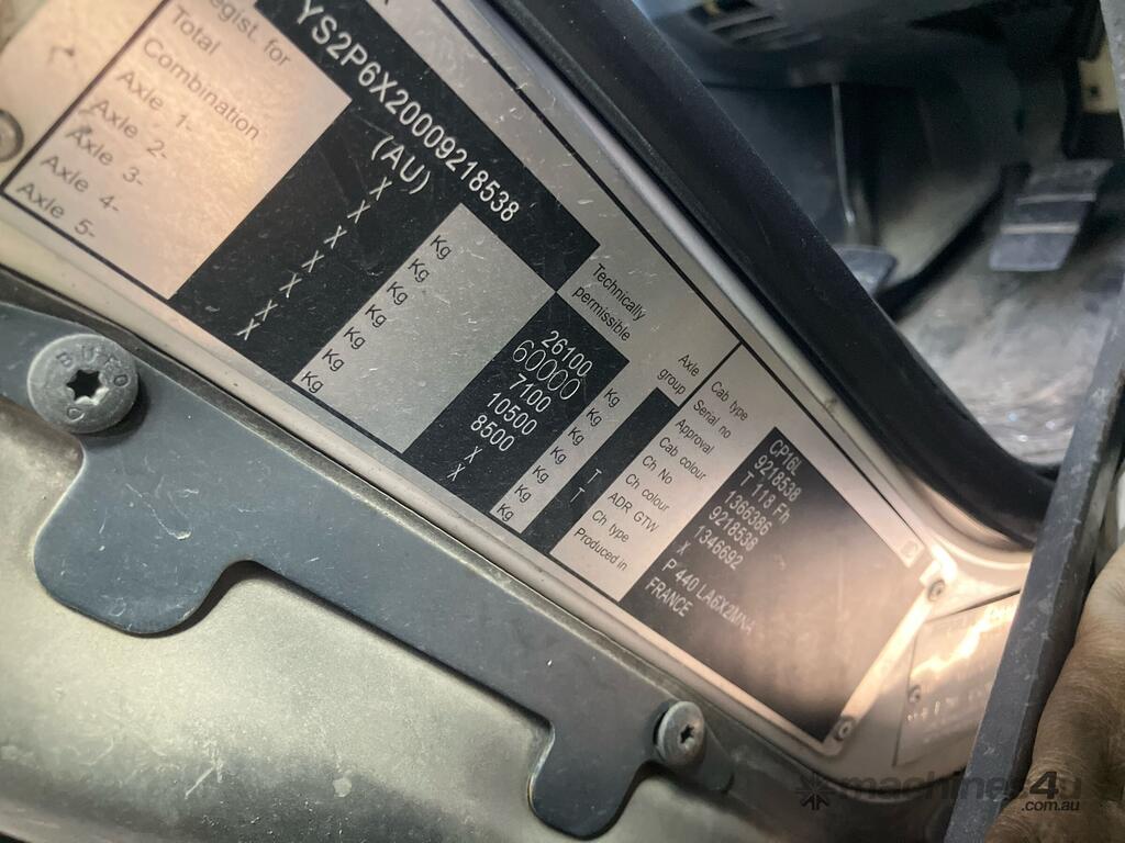 CP: 03/2017,Scania,P440,6x4 Prime Mover,Airbag,6 Cyl,Diesel,Odometer not visible,Hourmeter not visible,Colour: White,Rego. No: NP(XB05YG), Unregistered,VIN: YS2P6X8,GVM: 26100,GCM: 60000,Sold with No Plates,WOVR Status: WOVR N/A,Incident Type: Impact