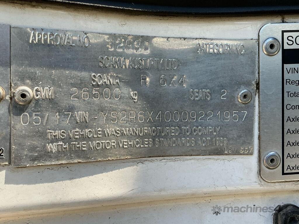 CP: 05/2017,Scania,R560,Prime Mover,Automatic,Airbag,8 Cyl,Diesel Turbo,466891 (Kms. Showing on Odometer),11338 (Hrs. Showing on Hour meter),Colour: White,Rego. No: NP(1GHN994), Unregistered WA,VIN: YS2R6X7,Length: 7.2 m,GVM: 26500,GCM: 90000,Sold with No Plates