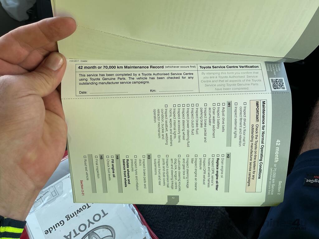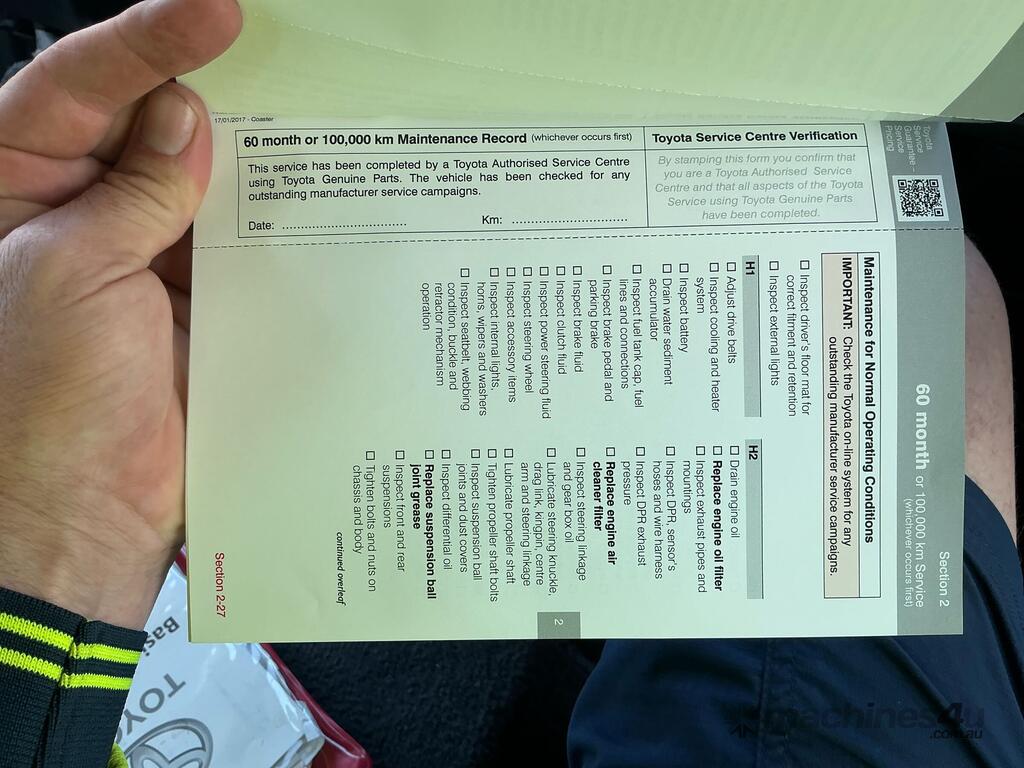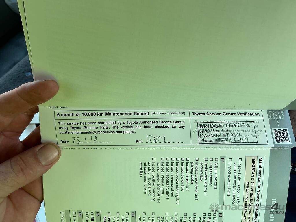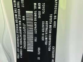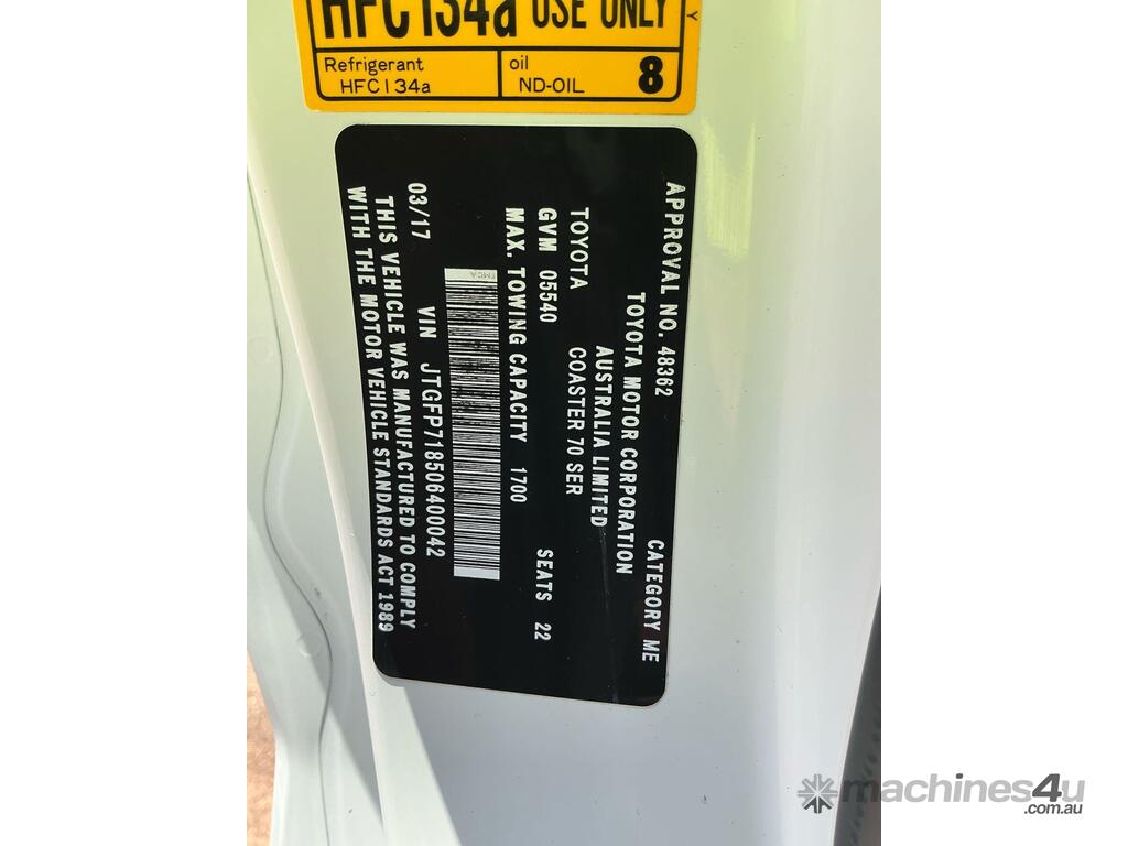 CP: 03/2017,Built: 02/2017,Toyota,Coaster,Bus,Manual,Engine #: N40CUH20956,4 Ltr,4 Cyl,Diesel,5 Gears,43309 (Kms. Showing on Odometer),Hourmeter not visible,Colour: White,Rego. No: NP(CC70JL), Unregistered NT,VIN: JTGFP42,GVM: 5540,Sold with No Plates