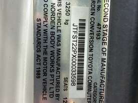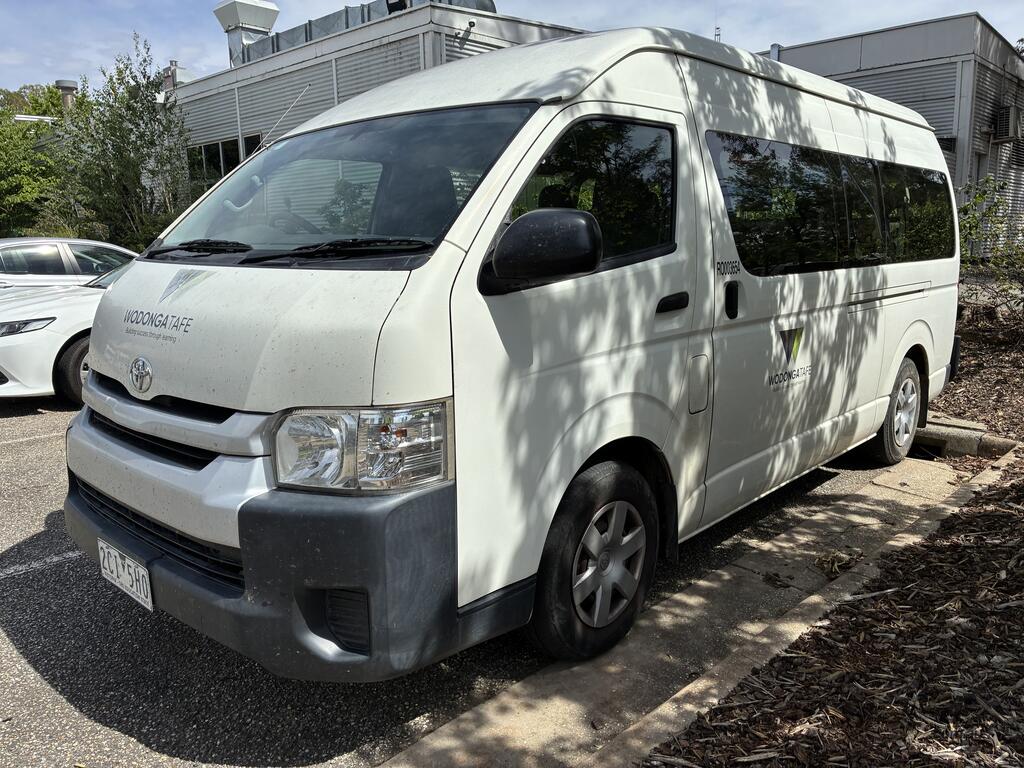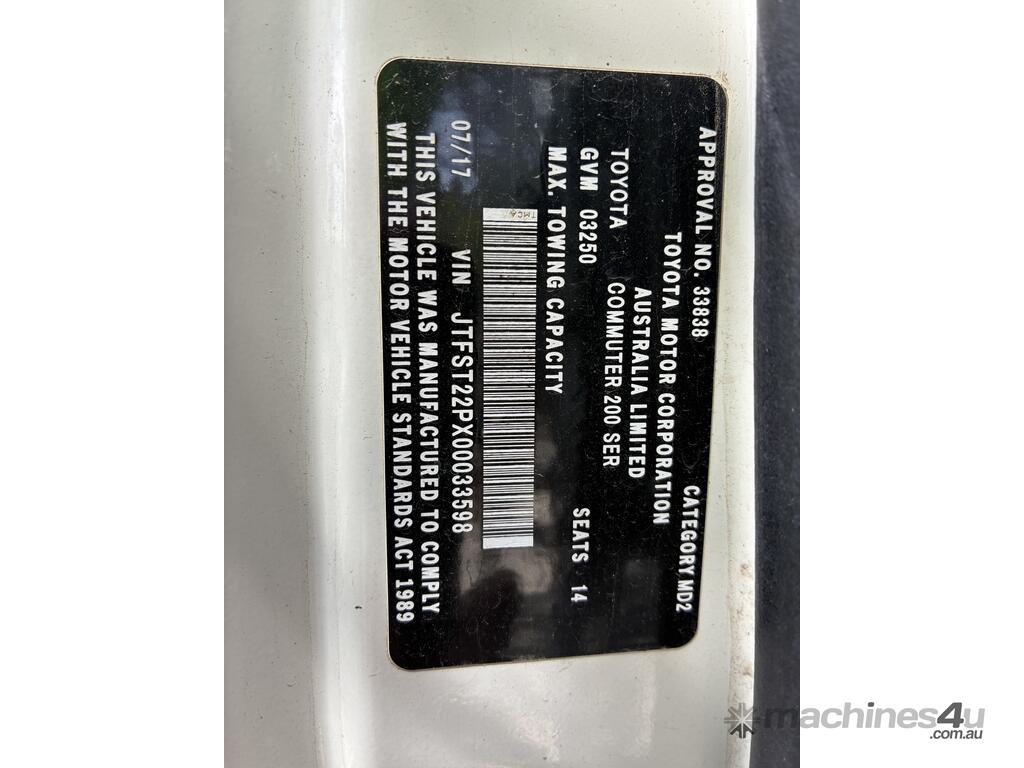 CP: 07/2017,Built: 07/2017,Toyota,Hiace,KDH223R Commuter,Bus,14 seats,4 doors,Automatic,Engine #: 1KD2739680,3 Ltr,4 Cyl,Diesel,Direct Injection,4 Gears,68259 (Kms. Showing on Odometer),Colour: White,Rego. No: NP(2CI5HO), Unregistered VIC,VIN: JTFST22PX00033598,Sold with No Plates