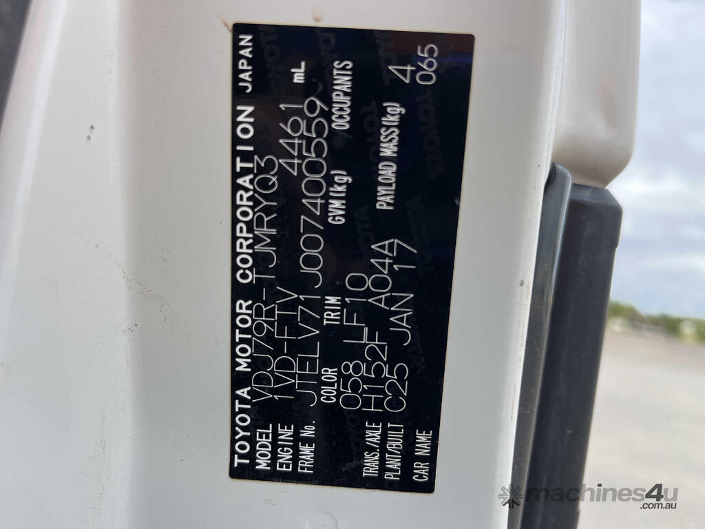 CP: 02/2017,Built: 01/2017,Toyota,Landcruiser,VDJ79R Workmate,Cab Chassis Single Cab,2 seats,2 doors,Manual,Engine #: 1VD0366721,4.5 Ltr,8 Cyl,Diesel,Direct Injection,5 Gears,251236 (Kms. Showing on Odometer),Colour: White,Rego. No: NP(038XHA), Unregistered QLD,VIN: JTELV71J,Trim: Vinyl,Grey,Sold with No Plates