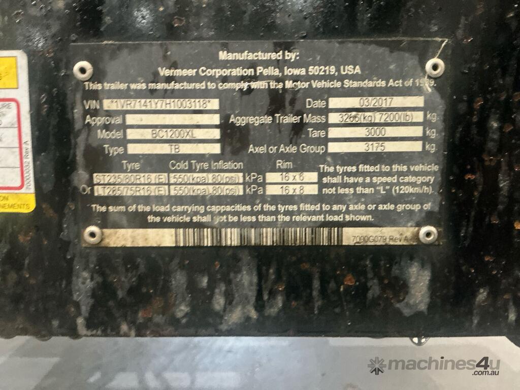 CP: 03/2017,Vermeer,BC1200XL,Wood Chipper (Trailer Mounted),Odometer not visible,624 (Hrs. Showing on Hour meter),Colour: Yellow,Rego. No: NP(Y77051), Unregistered,VIN: 1VR7141Y7H1003118,Sold with No Plates