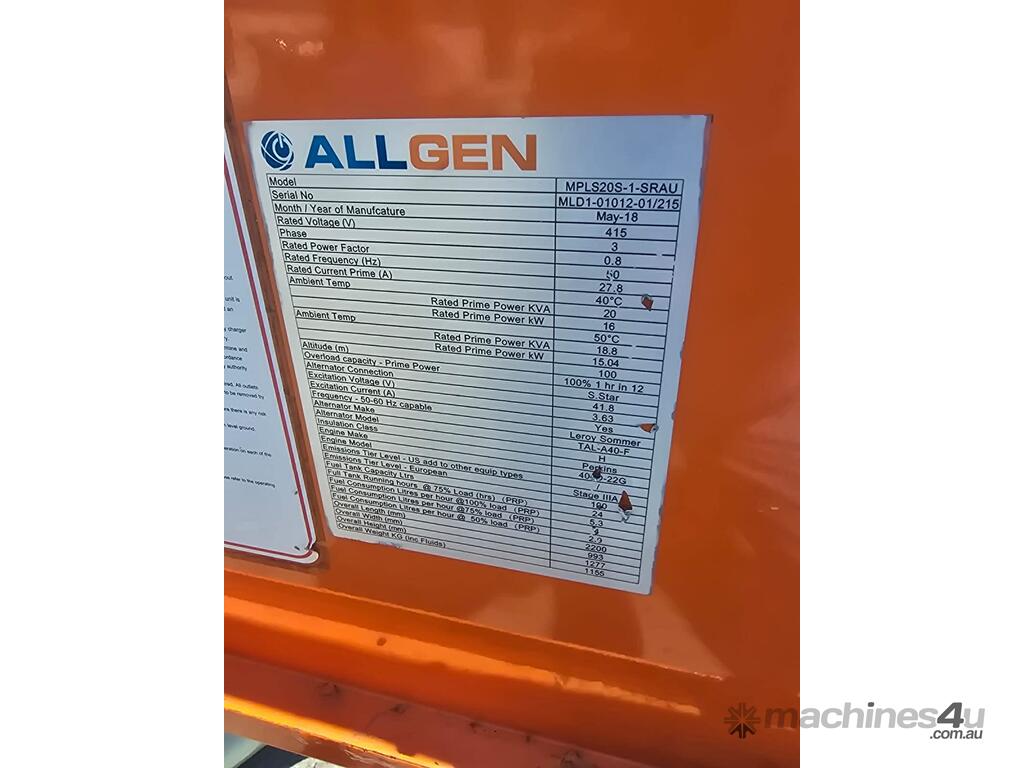 2018 Allgen Generator MPLS20S, S/N: MLD/215, Hours: 17,041, 3 Phase, 20kVA in Canopy, Perkins Engine, Includes Fire Extinguisher. Inspection Recommended, See Photos and Video For More Details. A Buyers Premium of 8.25% (GST Inc) Will Be Applied.