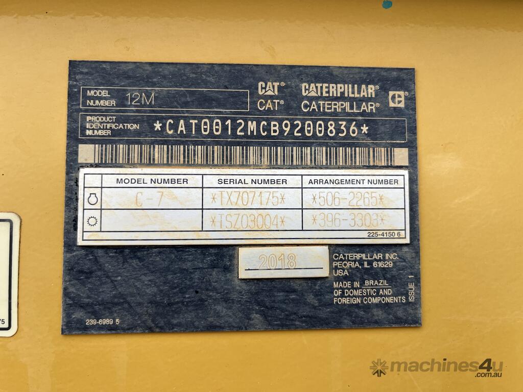 CP: CIRCA 2018,Caterpillar,12M VHP Plus,Grader,Engine #: TX707175,6 Cyl,Diesel,Odometer not visible,9092 (Hrs. Showing on Hour meter),Colour: Yellow,Rego. No: NP(E47079), Unregistered WA,VIN: CAT0012MCB9200836,Serial No: B9200836,Sold with No Plates
