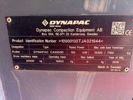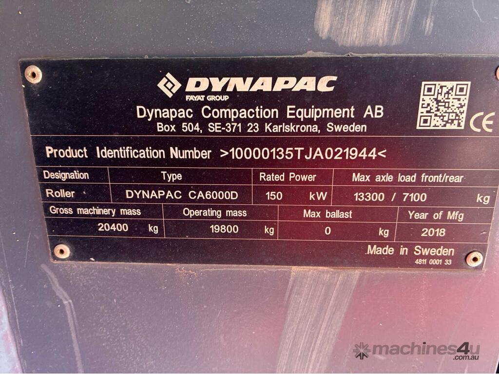 CP: CIRCA 2018,Dynapac,CA6000D,Articulated Smooth Drum Roller,6 Cyl,Diesel,Odometer not visible,3248 (Hrs. Showing on Hour meter),Colour: White,Unregistered,Serial No: 10000135TJA021944,ROPS No: 90331802,FOPS No: 90331802,Sold with No Plates,Key No: 30