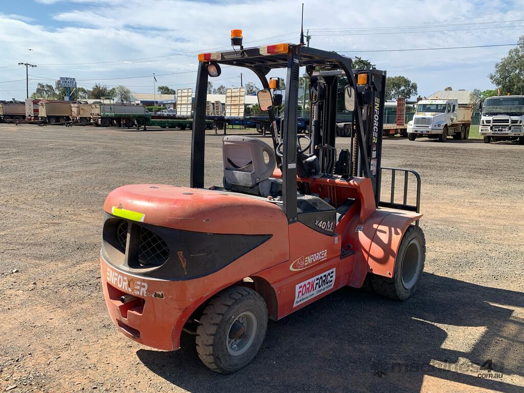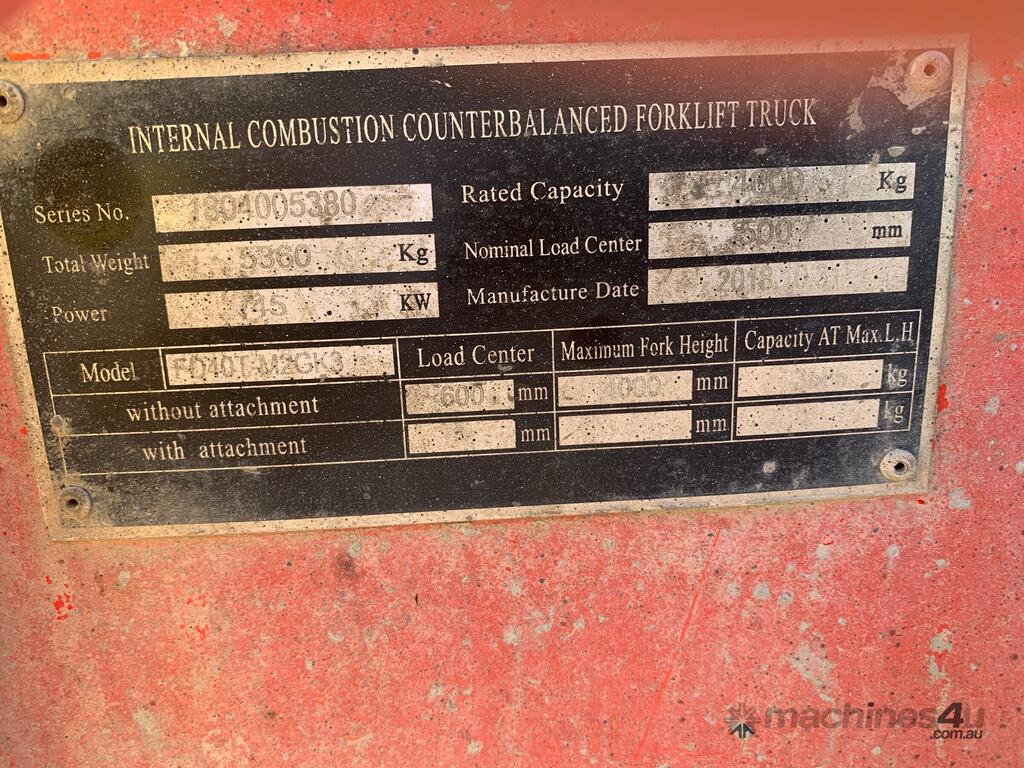 CP: 10/2018,Enforcer,FD40T-DMA,Counter Balance Forklift,Diesel,Odometer not visible,773 (Hrs. Showing on Hour meter),Colour: Red,Unregistered,Serial No: ,Sold with No Plates