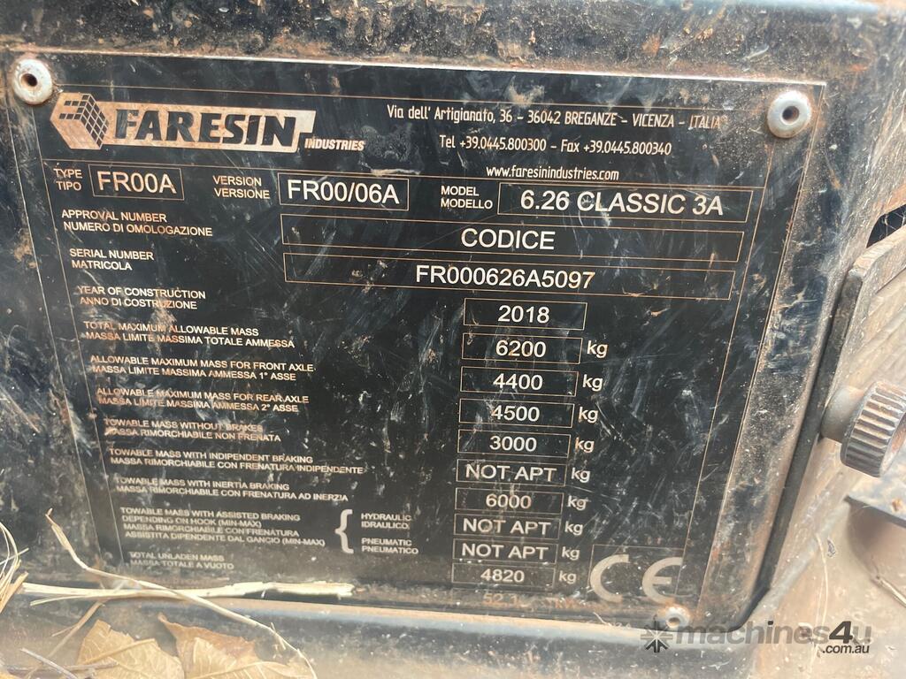 CP: CIRCA 2018,Faresin,9.60 GLS 3A,Telehandler,4 Cyl,Diesel,Odometer not visible,Hourmeter not visible,Colour: Green,Rego. No: NP(75596C), Unregistered QLD,Serial No: FR000626A5097,Sold with No Plates,WOVR Status: WOVR N/A,Incident Type: Impact