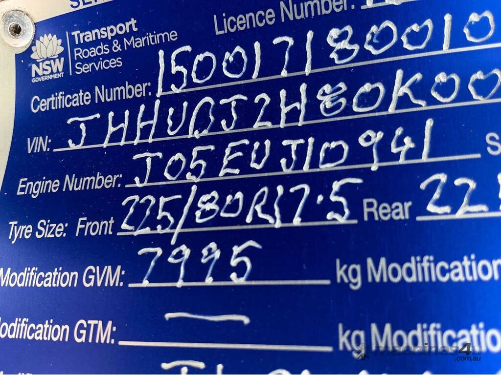 CP: 01/2018,Hino,300 921,Tipper,Automatic,Spring ,Engine #: J05EUJ10941,4 Cyl,Diesel Turbo,53477 (Kms. Showing on Odometer),Hourmeter not visible,Colour: White,Rego. No: CP71KE NSW,Rego expiry: 15/09/2026,VIN: JHHUDJ2H80K003079,Key No: 321S,Length: 5.9 m,GVM: 7995,GCM: 12000,Sold with No Plates,Key No: 321S