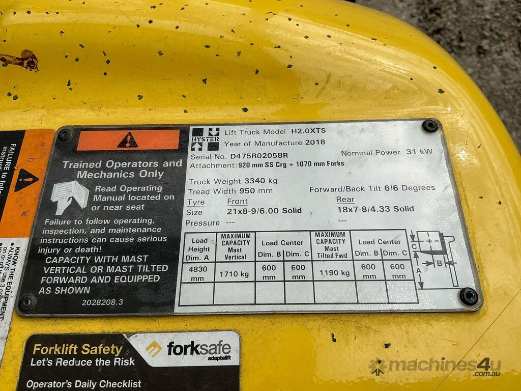 CP: CIRCA 2018,Hyster,H2.0XTS,Forklift,4 Cyl,Odometer not visible,228 (Hrs. Showing on Hour meter),Colour: Yellow,Rego. No: NP(75R02058R), Unregistered,Serial No: D475R02058R,Sold with No Plates,Key No: 2