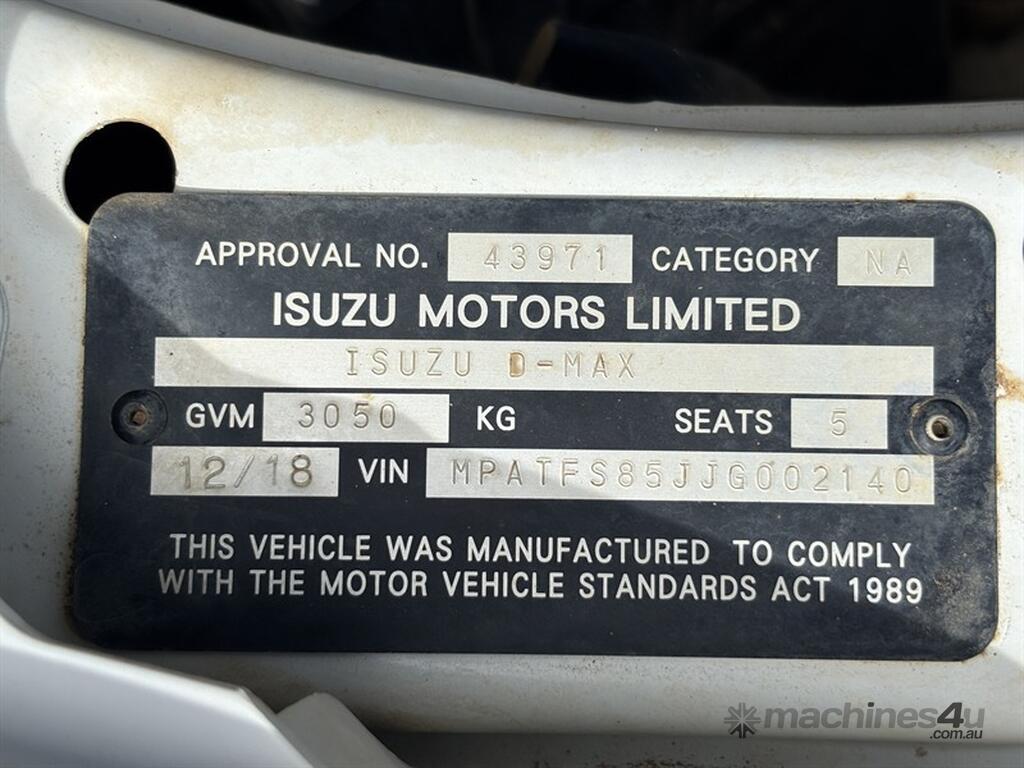 2018 ISUZU DMAX UTE, VIN: MPATFS85JJG002140, E/N: ###, 156,549 KM SHOWING, NO REGISTRATION, NO RWC. LOCATION: HALFERTY STREET, EMERALD, QLD 4720. INSPECTIONS & COLLECTIONS: MONDAY TO FRIDAY, 8AM TO 4PM. ENQUIRIES: JOHN MCDOUGALL ON OR JOHNEMERALDAUCTIONCENTRE